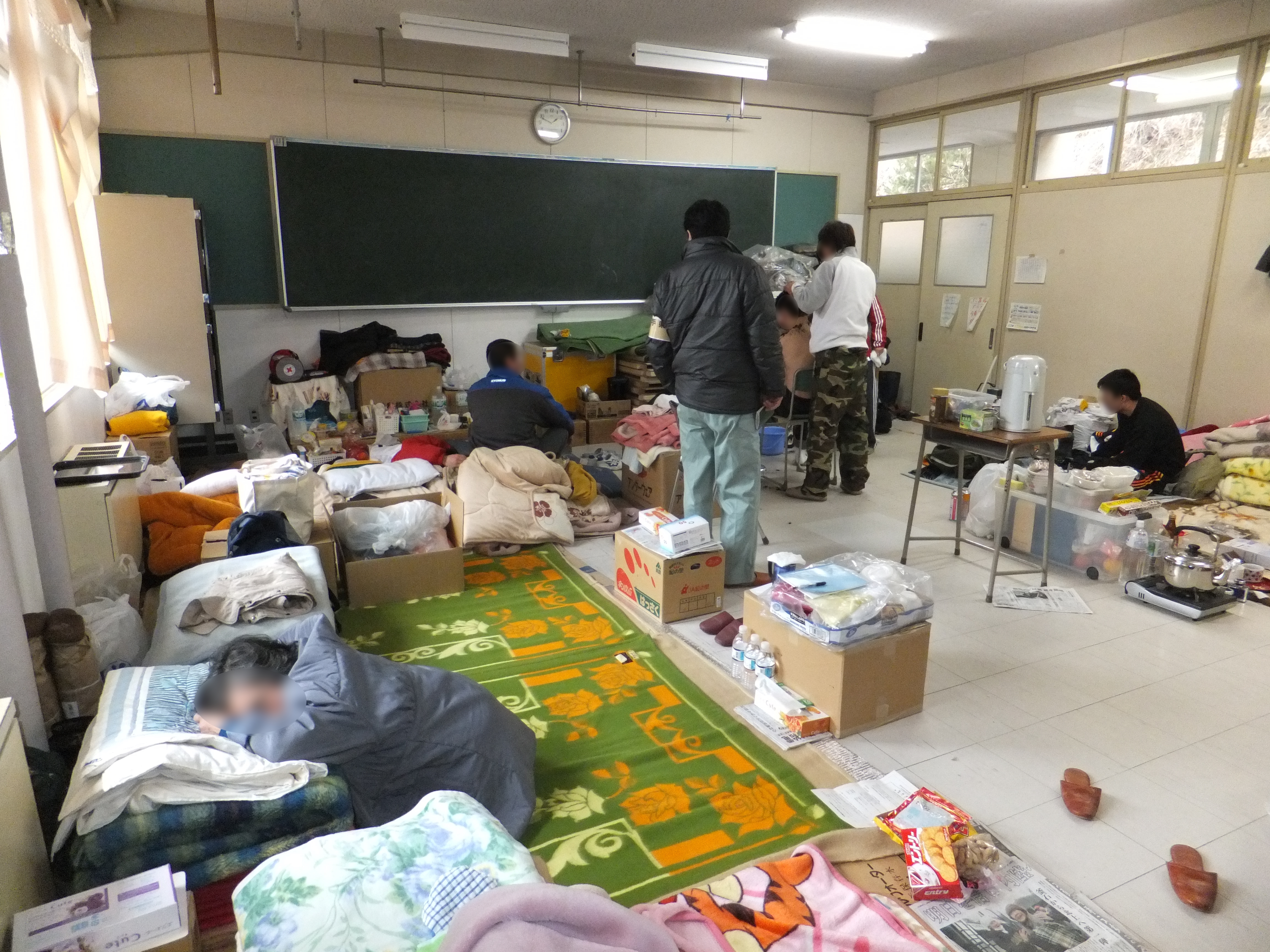 避難所内部教室の様子、散髪をしてもらっている人がいる