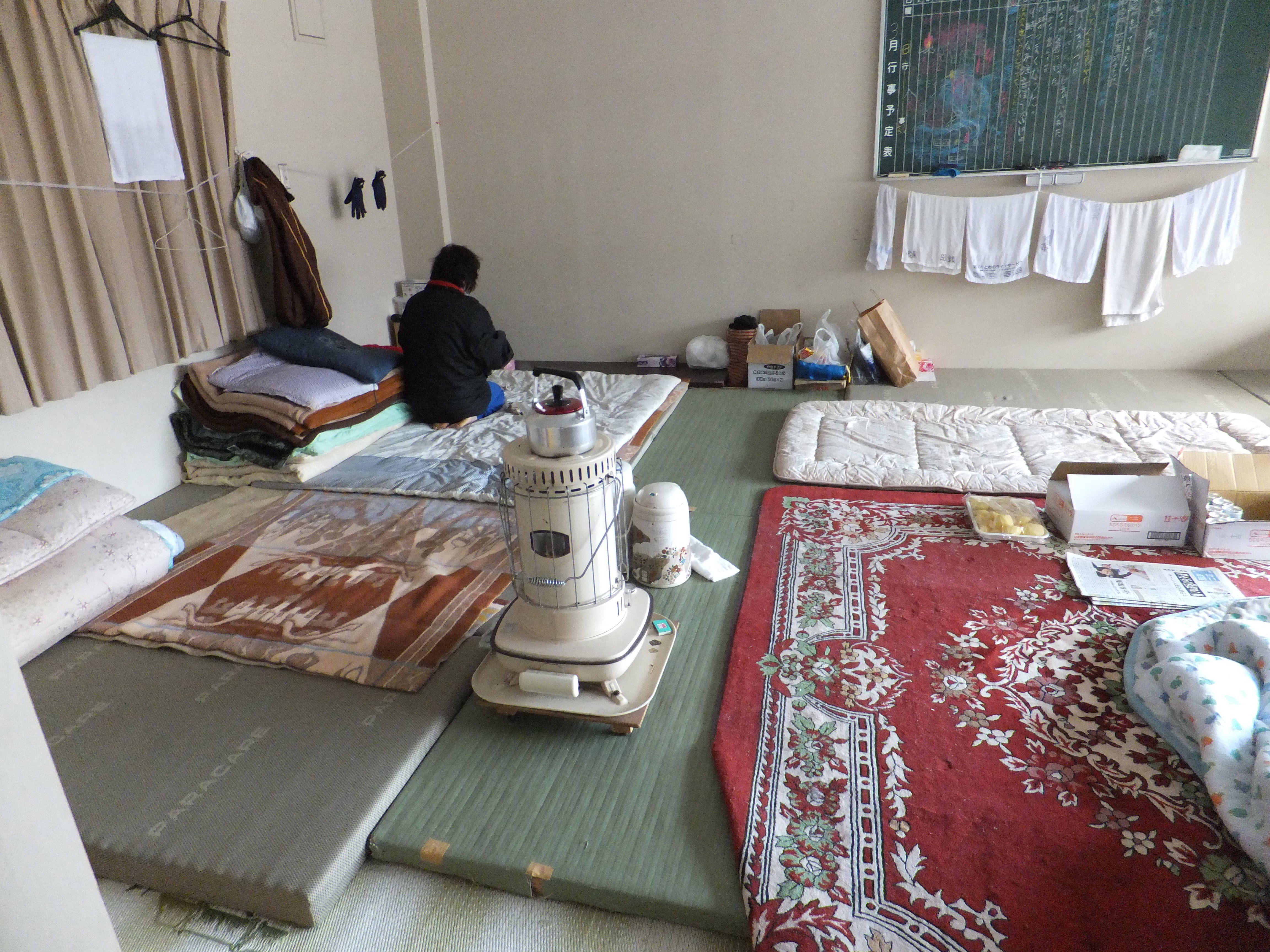 避難所内部の様子、床の上に畳が敷いてある