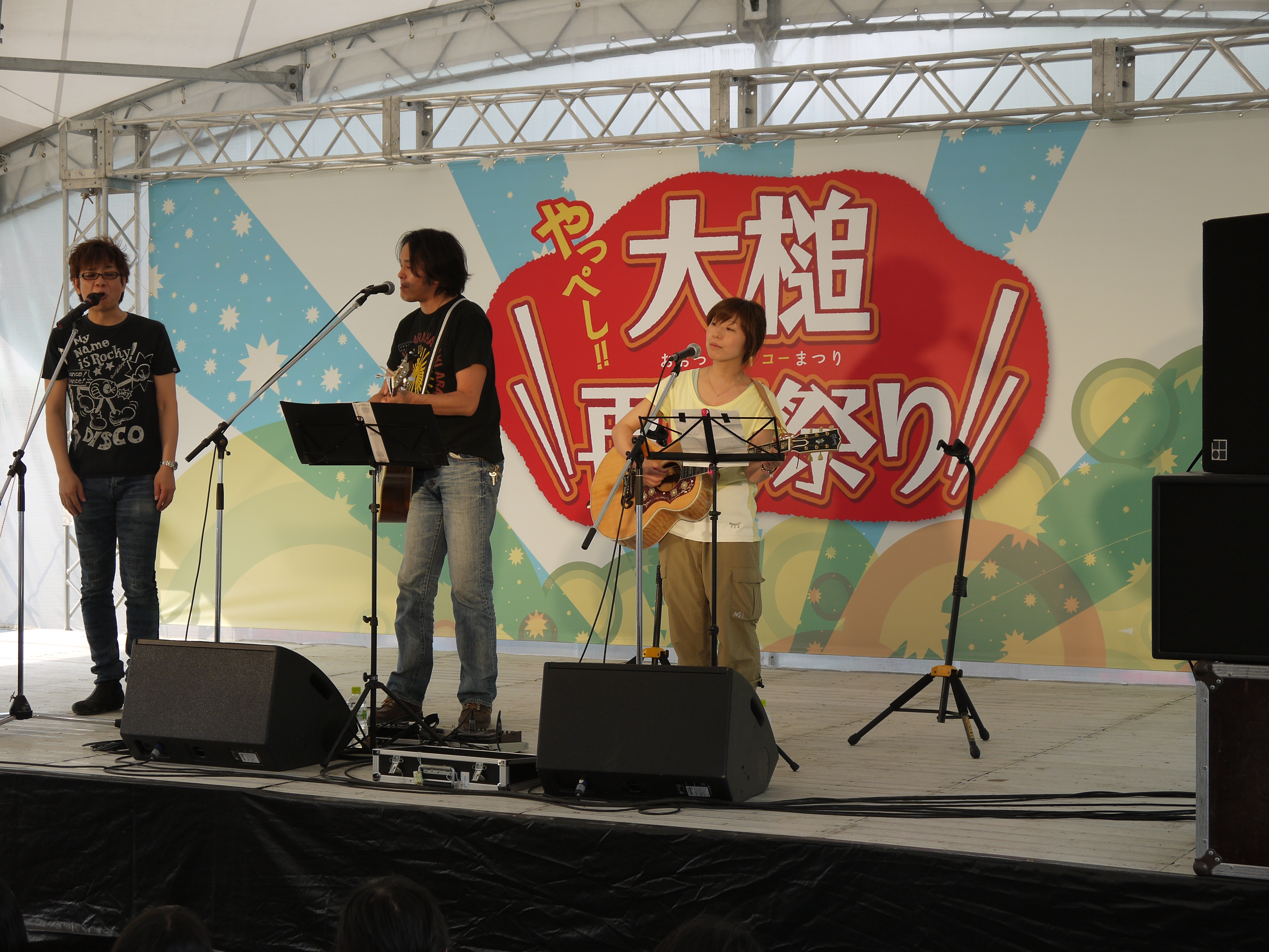 大槌中学校で開催された「やっぺし!大槌再興祭り」で演奏する山寺宏一氏、坂本サトル氏、石野田奈津代氏