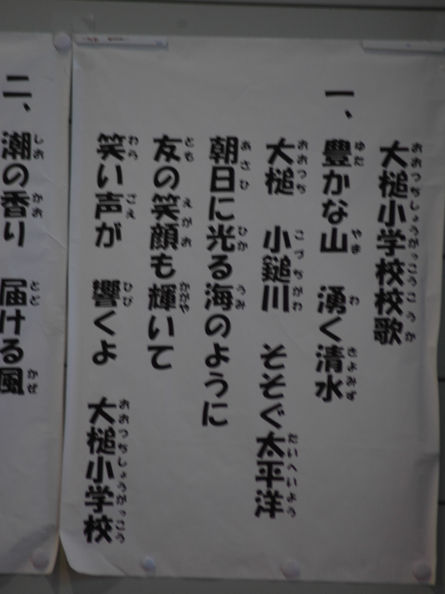 新大槌小学校開校式 拡大表示 ダウンロード 識別子 : 9426 タイトルよみ : シンオオツチショウガッコウカイコウシキ 說明・要約 : 新大槌小学校校歌一番の歌詞 作成者(撮影者) : 大槌町 作成者(撮影者)よみ : オオツチチョウ 提供者 : 提供者よみ : 撮影(作成)場所 : 岩手県上閉伊郡大槌町 寺野 撮影(作成)場所よみ : イワテケンカミヘイグンオオツチチョウ テラノ 作成日・撮影日 : 2013年 4月 4日 カテゴリー : 学校・教育 地域 : 小鎚・臼澤地区 備考 : 震災事象 住民(ふるさと科 学校 住民の災害対策 イベント) > 仮設住宅 (1年〜2年目 暮らし再生・復興計画づくり)期 > 新大槌小学校の開校式が開催。鳩岡美香さんと大久保正人さん作詞作曲の新校歌が披露。