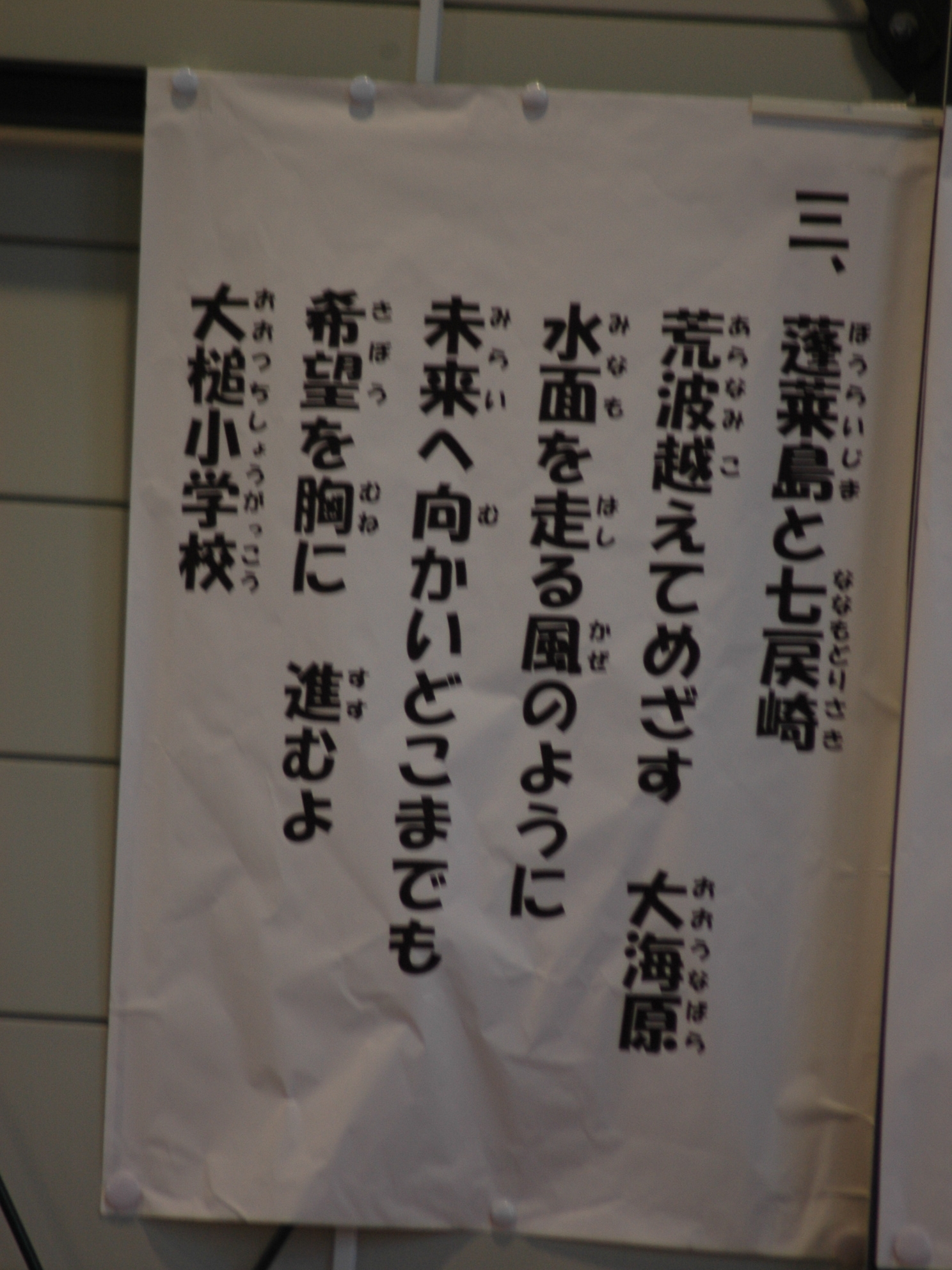 新大槌小学校開校式 拡大表示 ダウンロード 識別子 : 9428 タイトルよみ : シンオオツチショウガッコウカイコウシキ 說明・要約 : 新大槌小学校校歌三番の歌詞 作成者(撮影者) : 大槌町 作成者(撮影者)よみ : オオツチチョウ 提供者 : 提供者よみ : 撮影(作成)場所 : 岩手県上閉伊郡大槌町 寺野 撮影(作成)場所よみ : イワテケンカミヘイグンオオツチチョウ テラノ 作成日・撮影日 : 2013年 4月 4日 カテゴリー : 学校・教育 地域 : 小鎚・臼澤地区 備考 : 震災事象 住民(ふるさと科 学校 住民の災害対策 イベント) > 仮設住宅 (1年〜2年目 暮らし再生・復興計画づくり)期 > 新大槌小学校の開校式が開催。鳩岡美香さんと大久保正人さん作詞作曲の新校歌が披露。