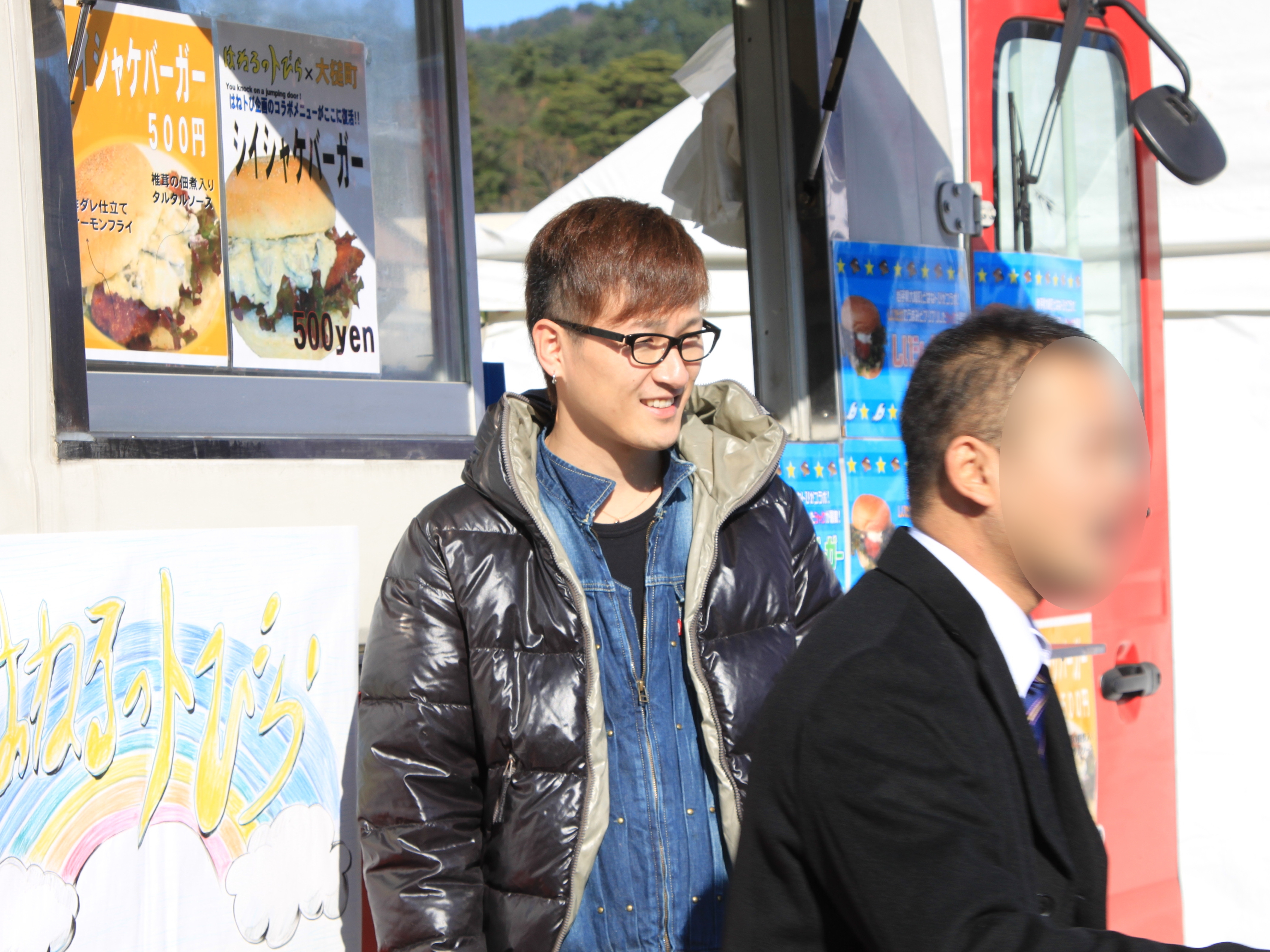おおつち鮭まつりでタレントが記念撮影をしている様子