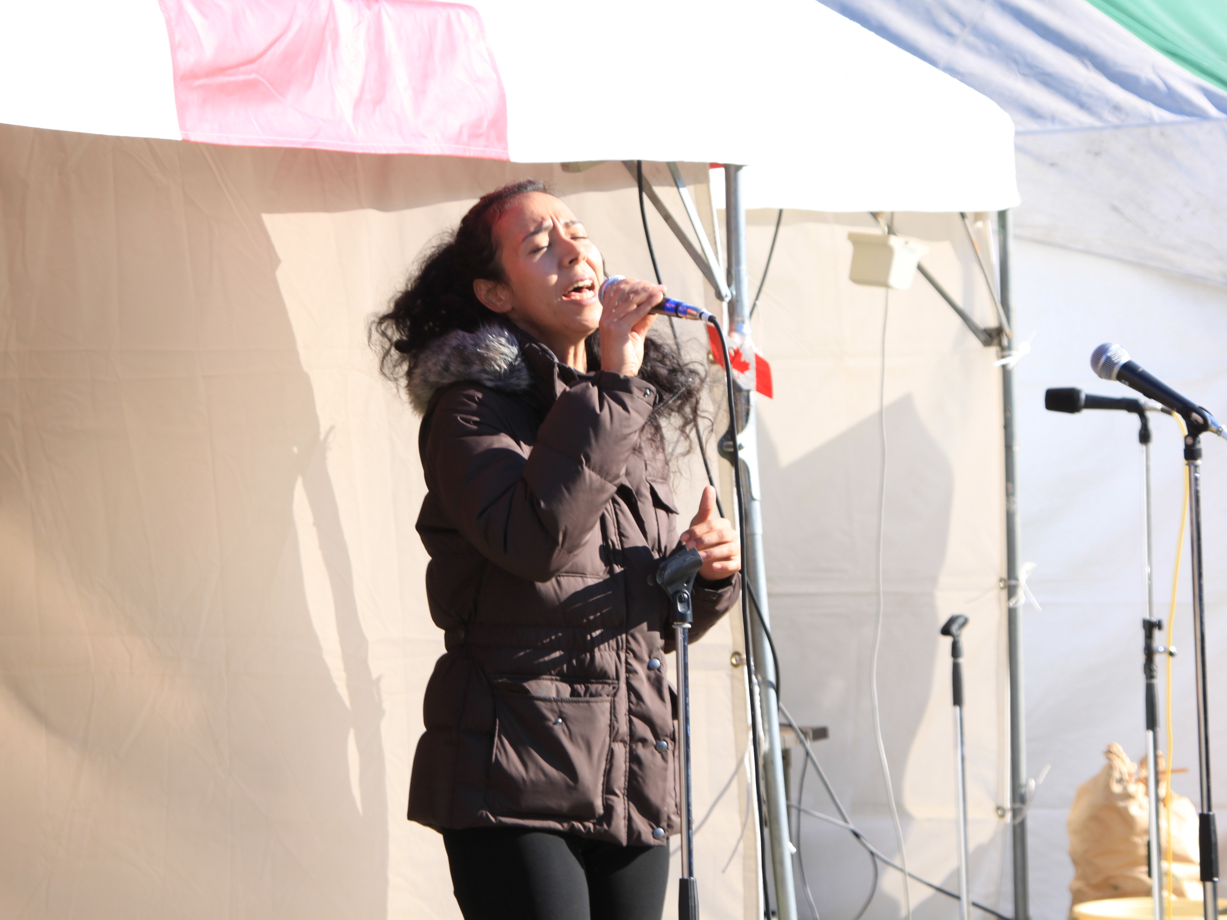 テント前で歌っているミュージシャンの様子