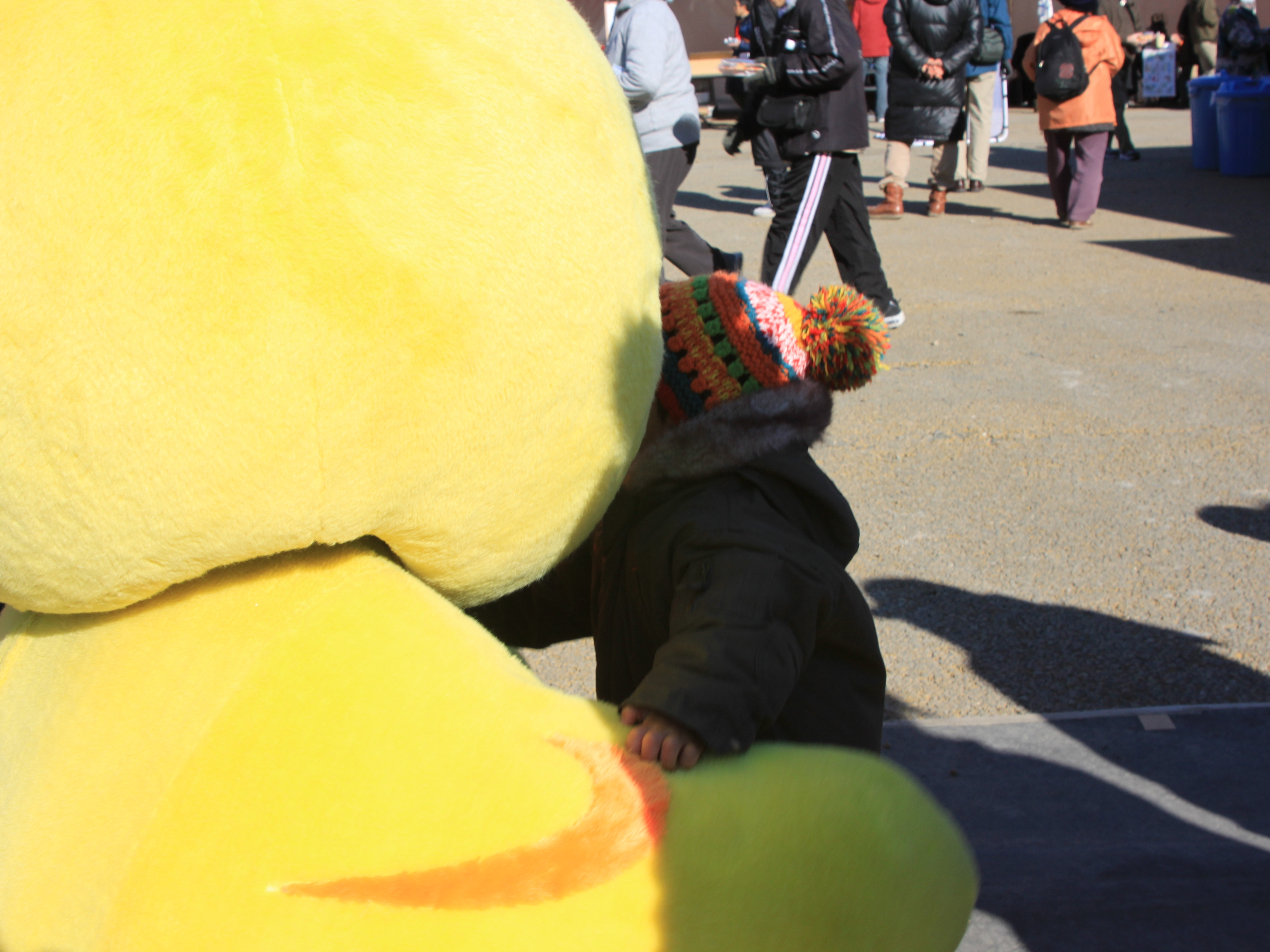 おおつち鮭まつり会場でマスコットと遊ぶ子供の様子