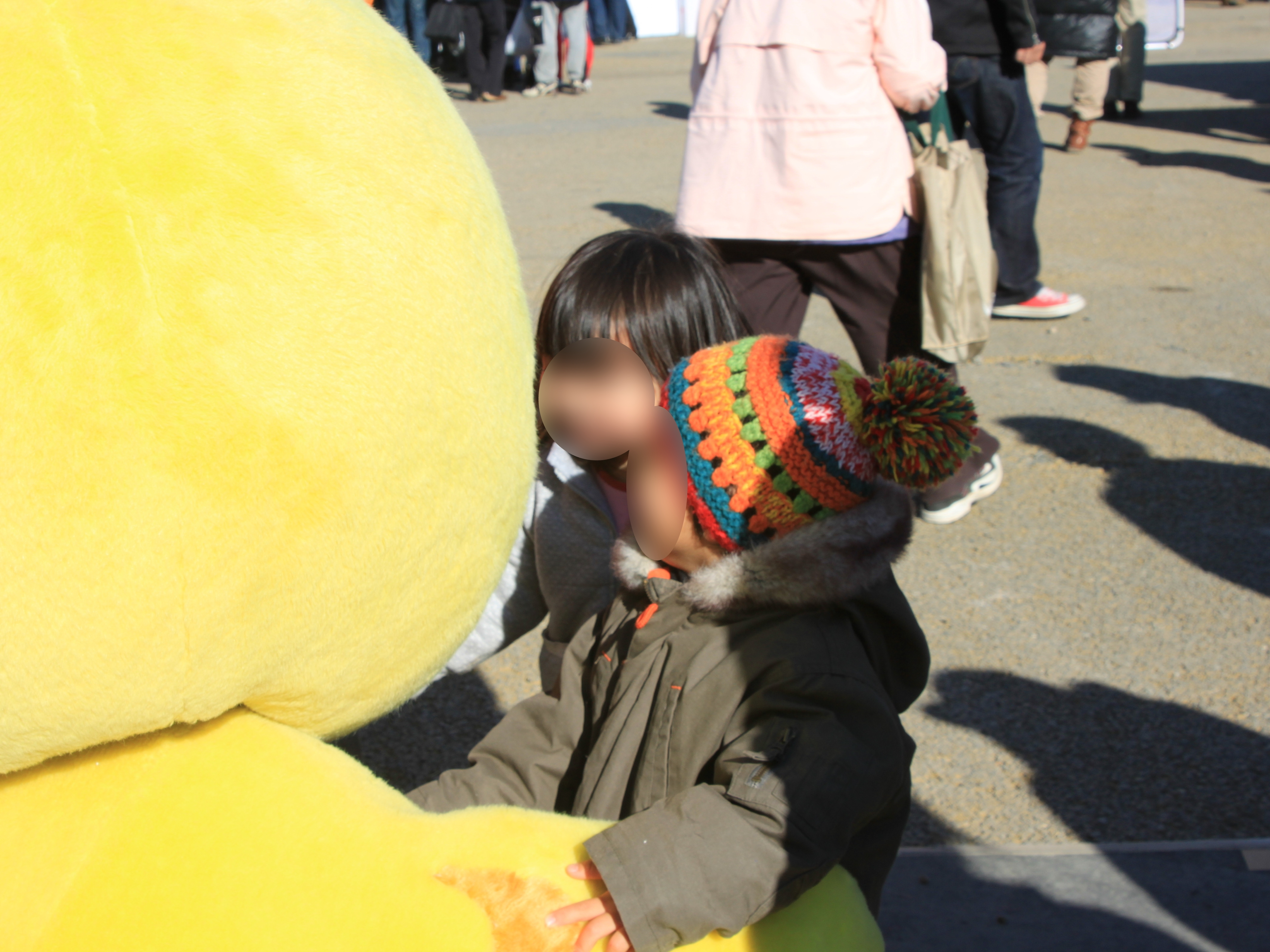 おおつち鮭まつり会場でマスコットと遊ぶ子供の様子