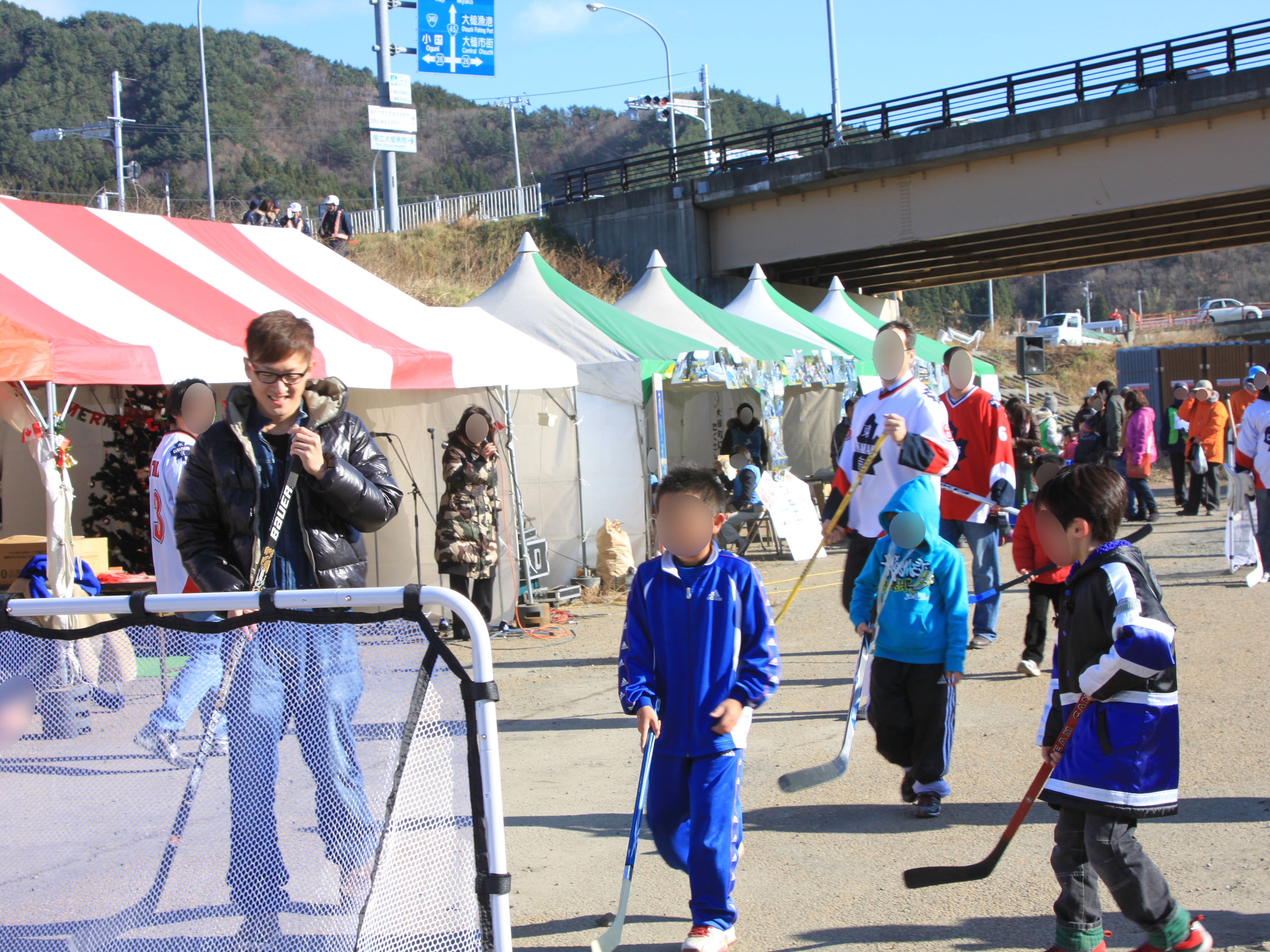 おおつち鮭まつり会場でカナダ人とホッケーをして遊ぶ子供の様子