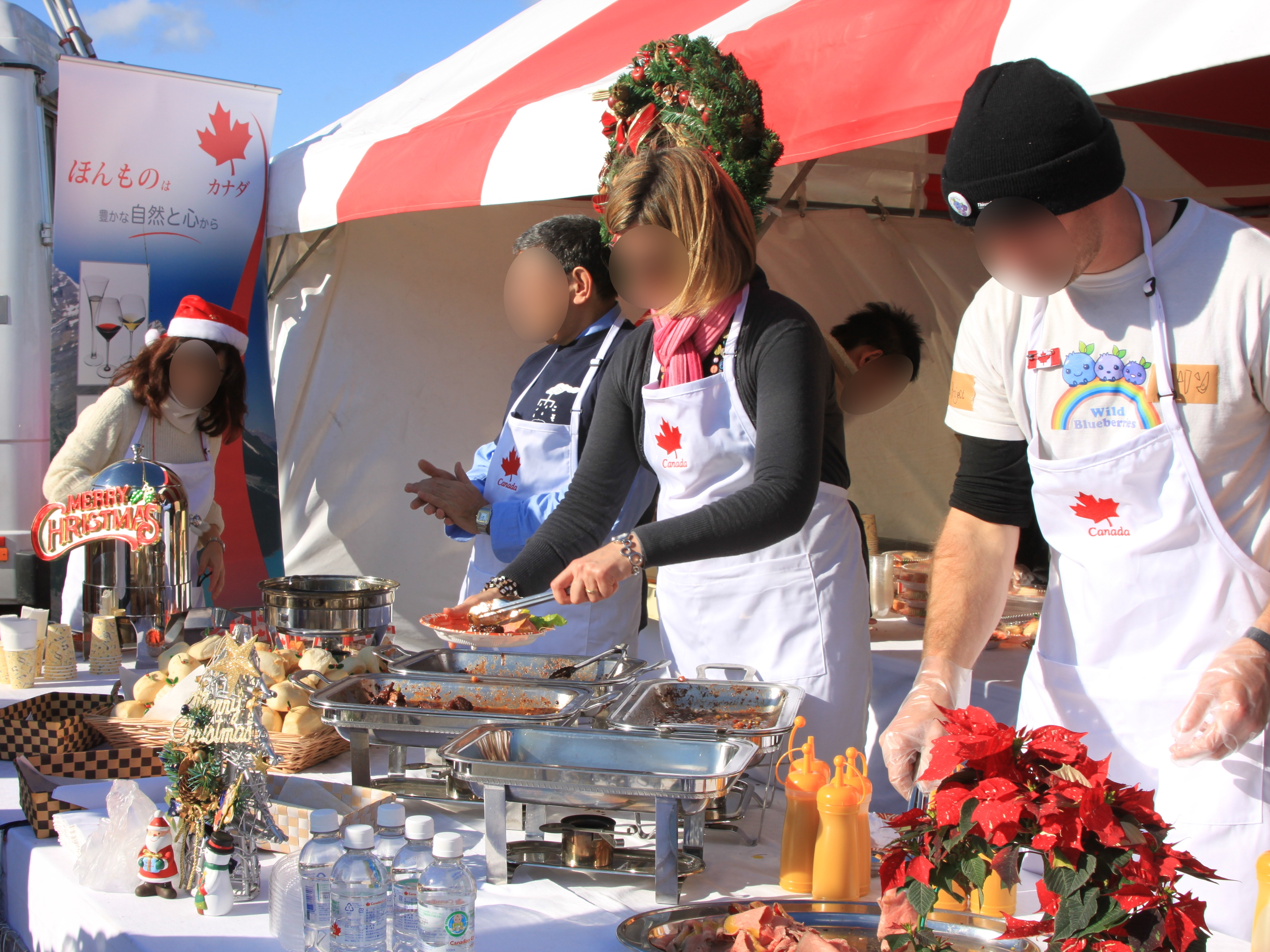 おおつち鮭まつり会場で参加者に料理を振る舞うカナダ人の様子