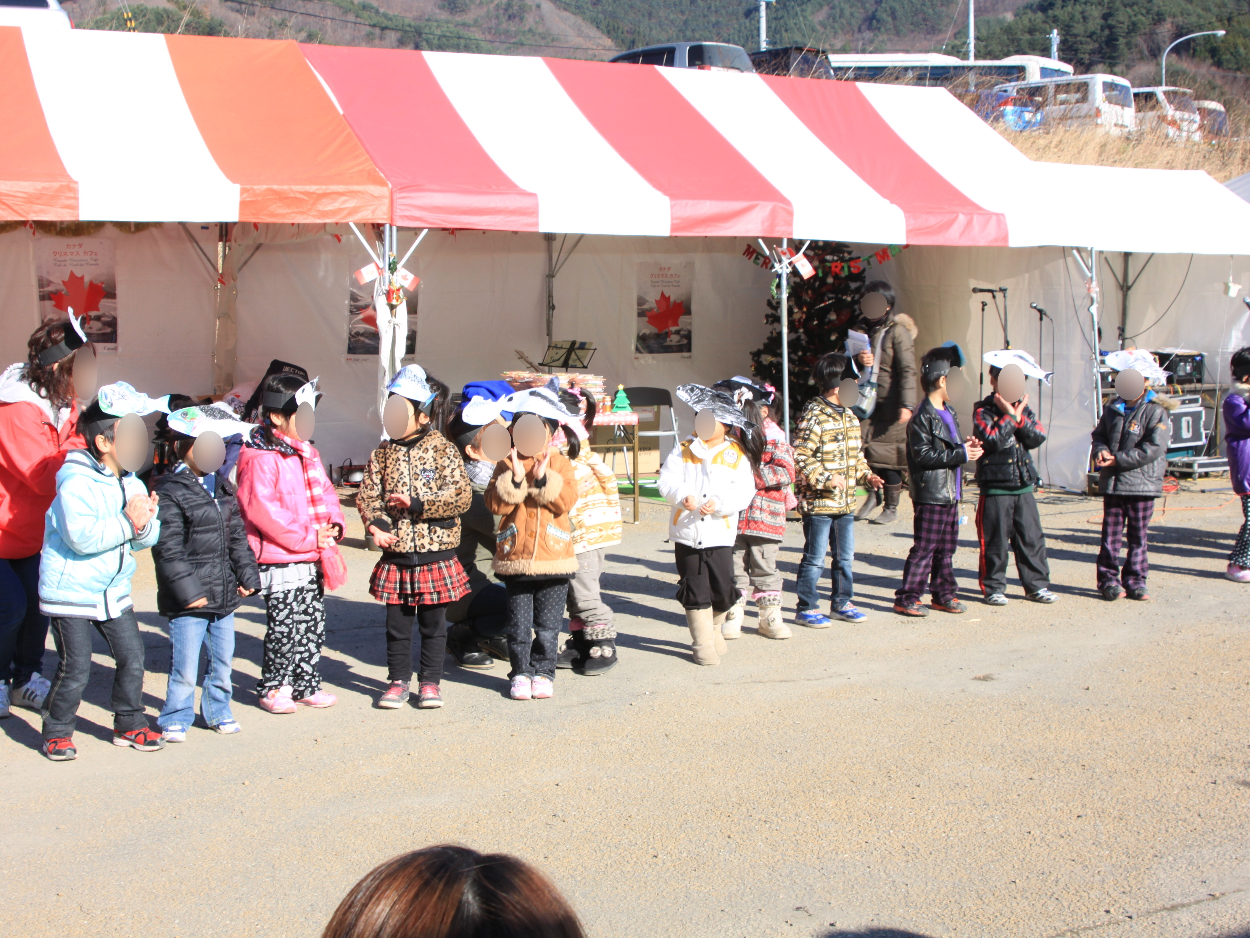 おおつち鮭まつり会場で魚の絵を頭にかぶって参加した子供たちの様子
