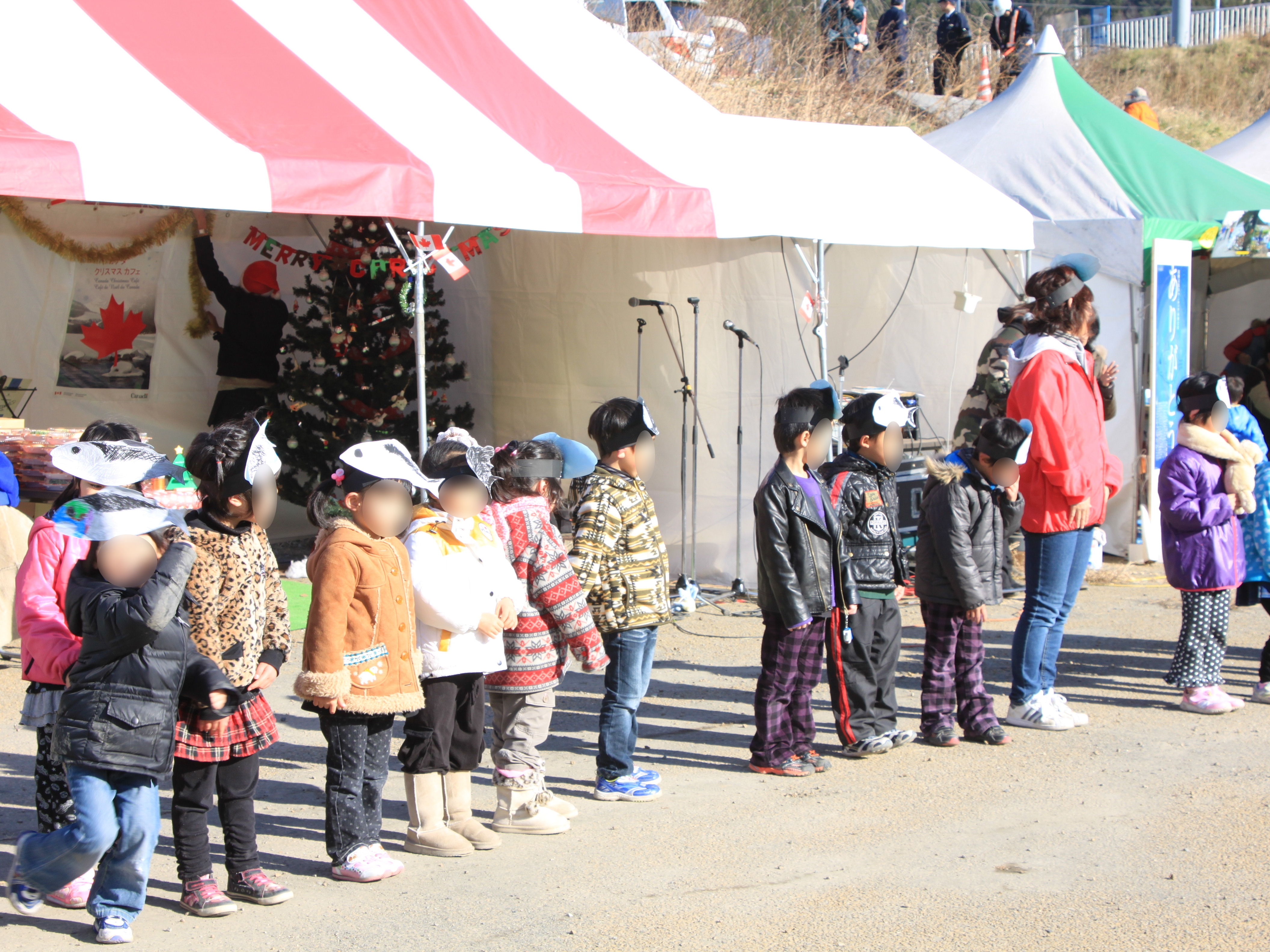 おおつち鮭まつり会場で魚の絵を頭にかぶって参加した子供たちの様子