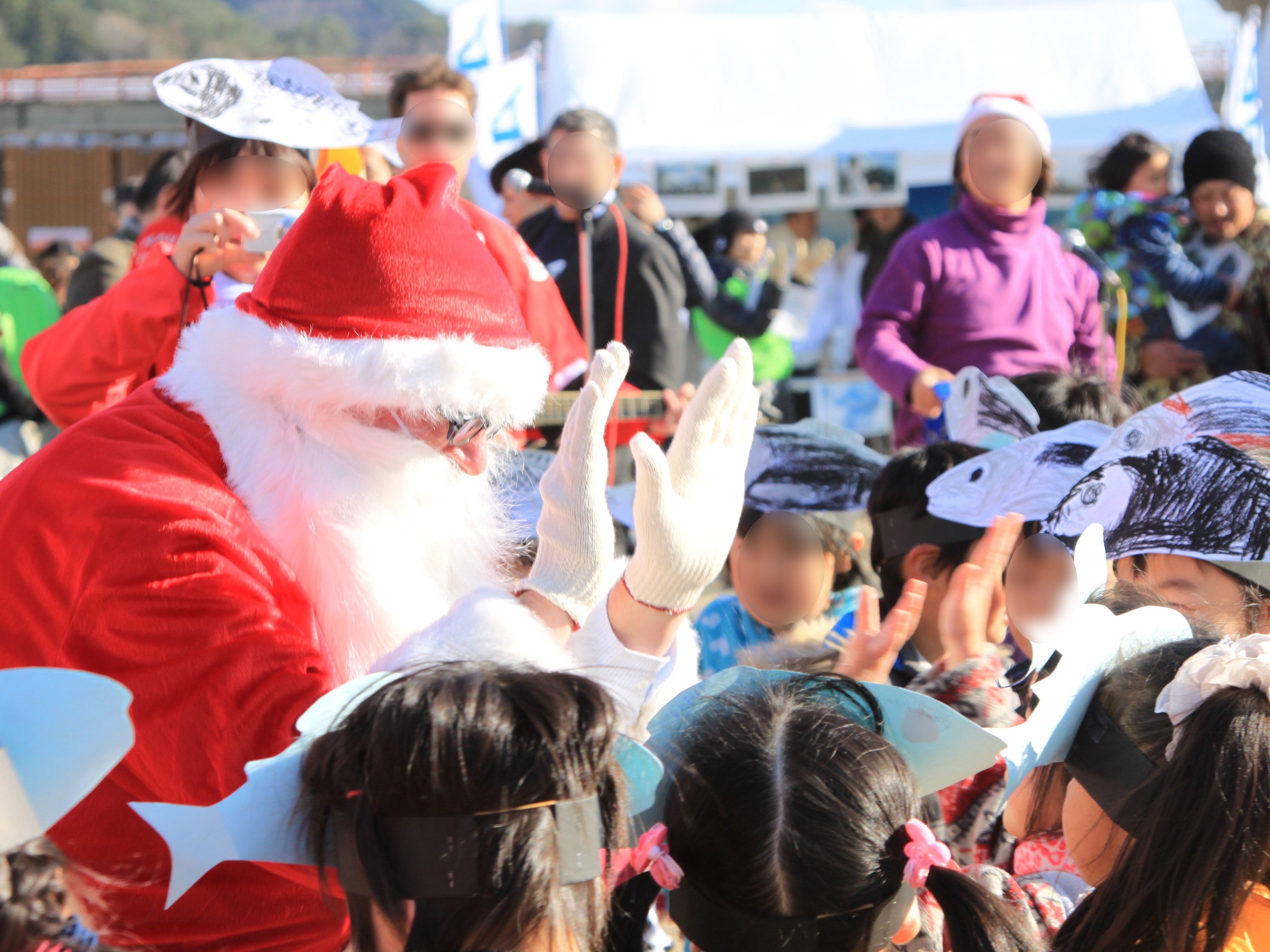 おおつち鮭まつり会場での参加者とサンタクロースの様子