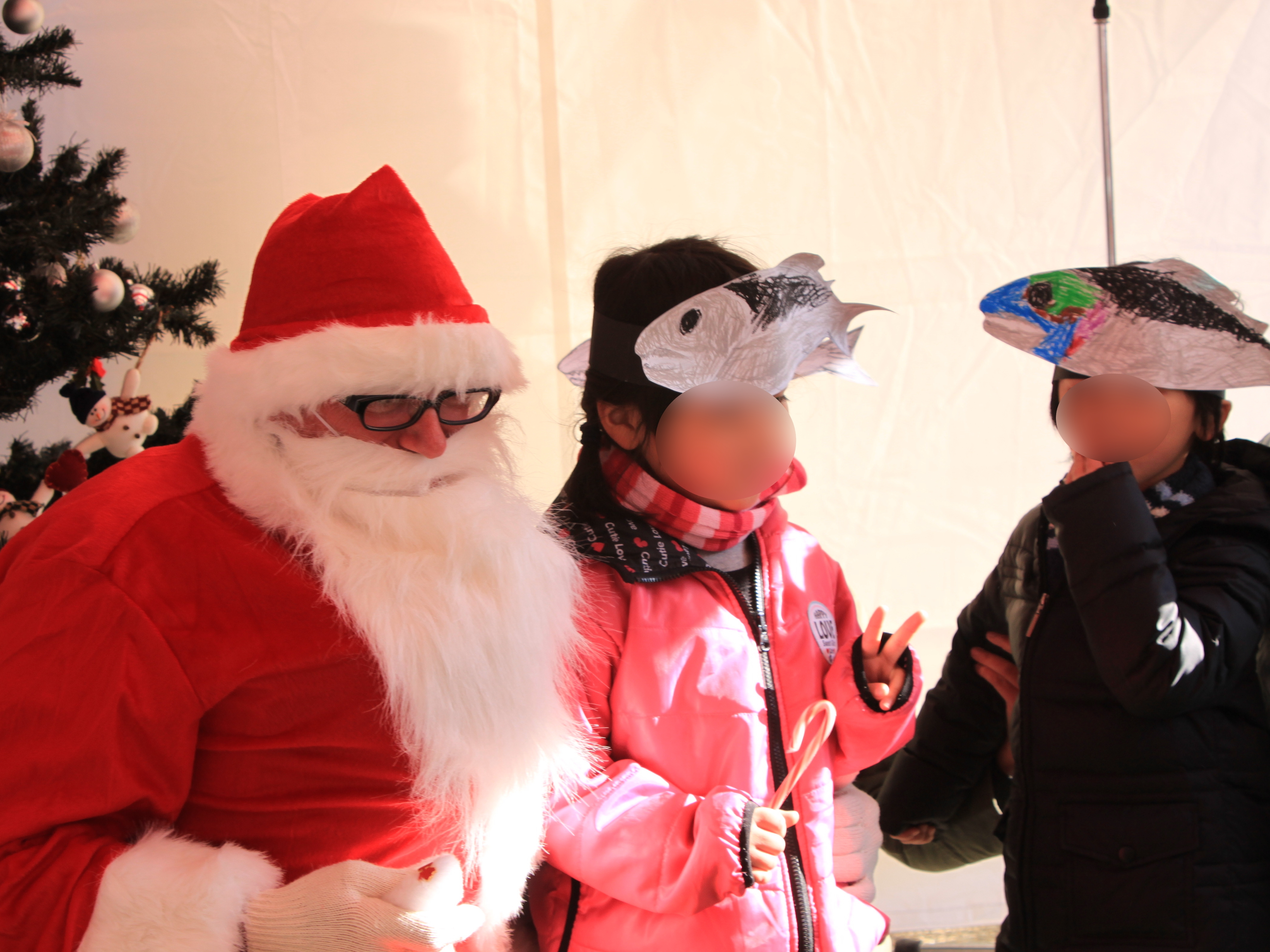 サンタクロースと一緒に記念撮影をする子供たち