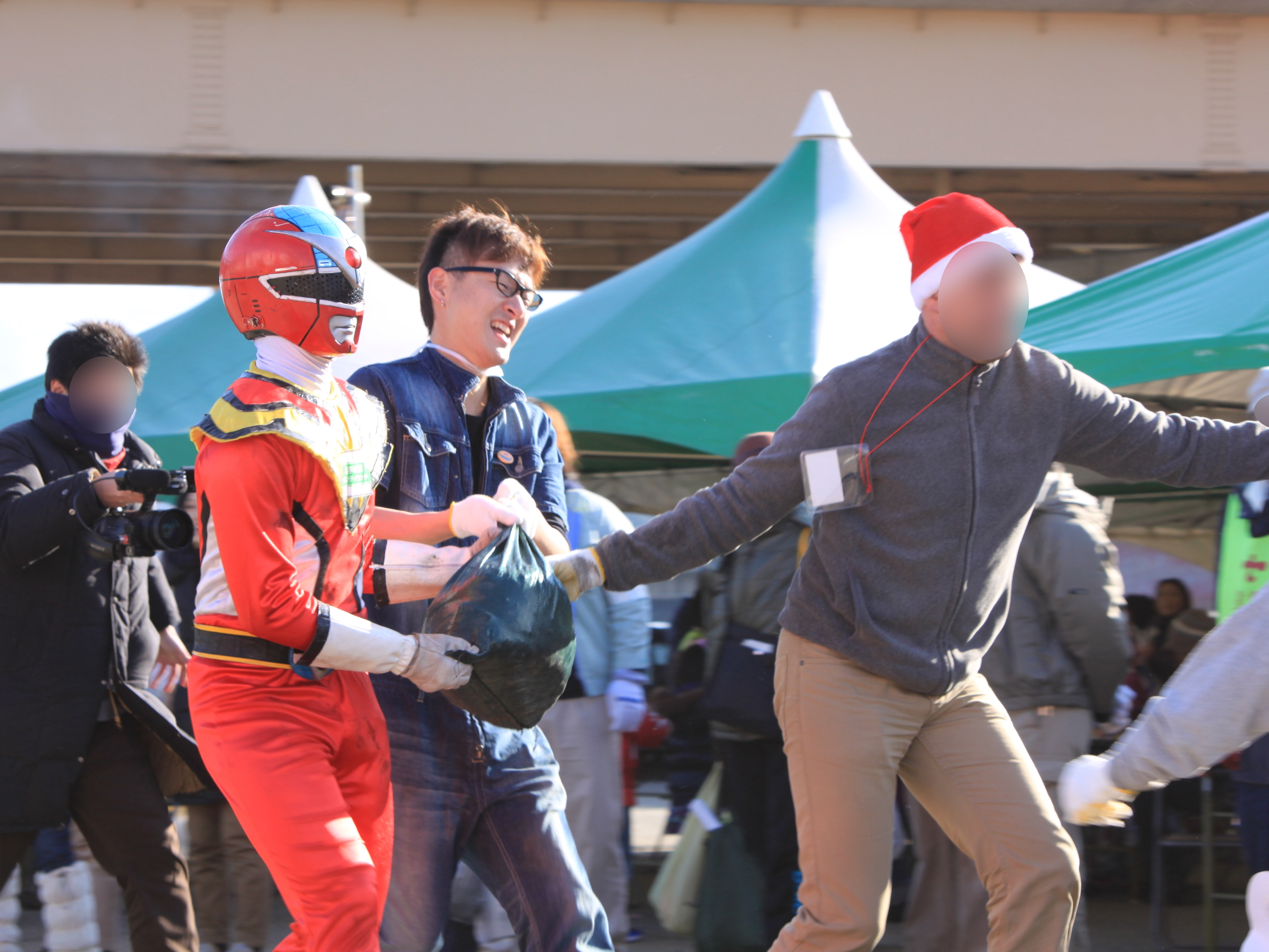カナダの人たちと参加者が重い袋をリレーで運ぶゲームをしている様子