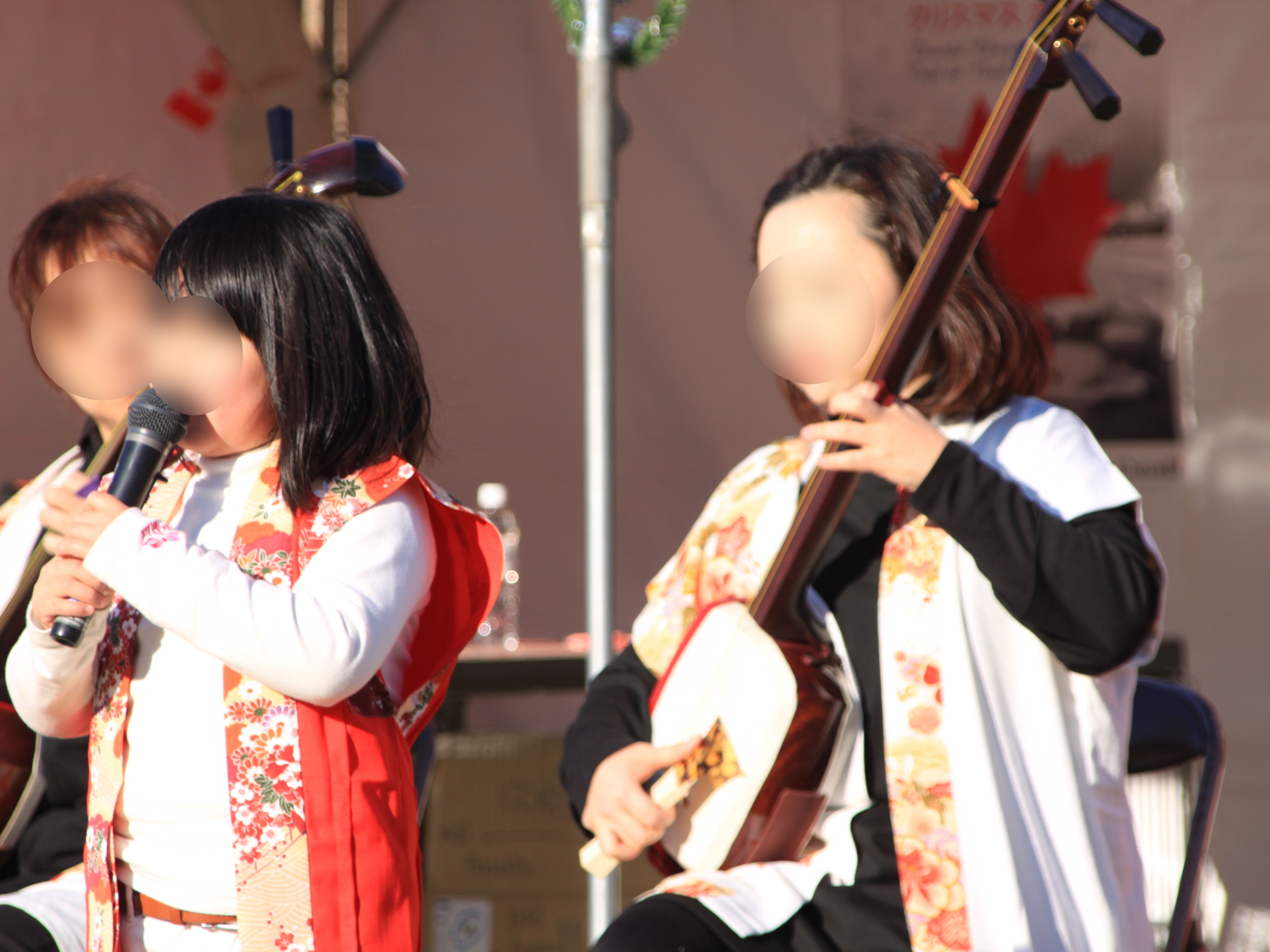 おおつち鮭まつりの会場で三味線に合わせて歌っている子供の様子