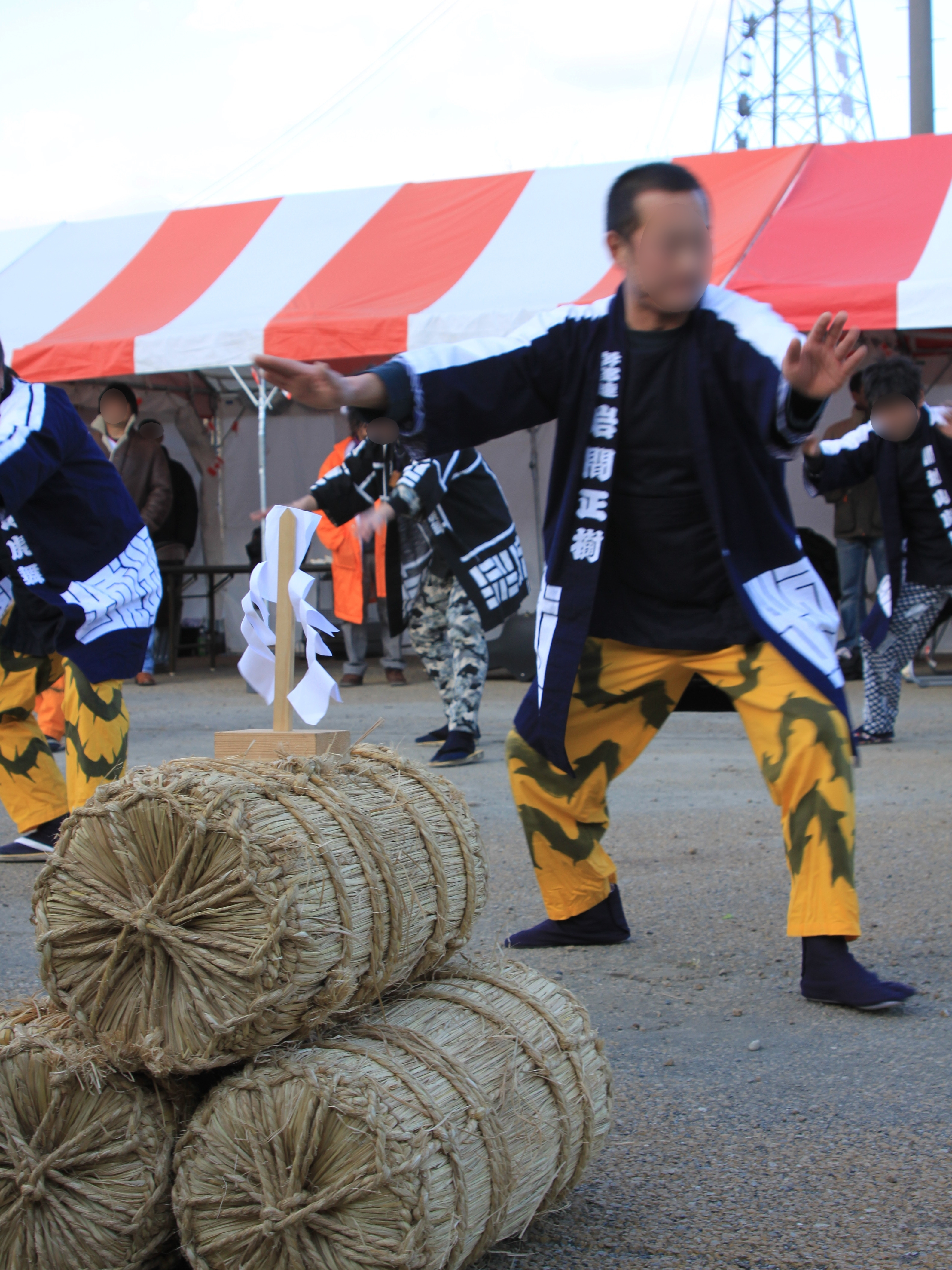 おおつち鮭まつり会場で米俵を使って舞っている様子