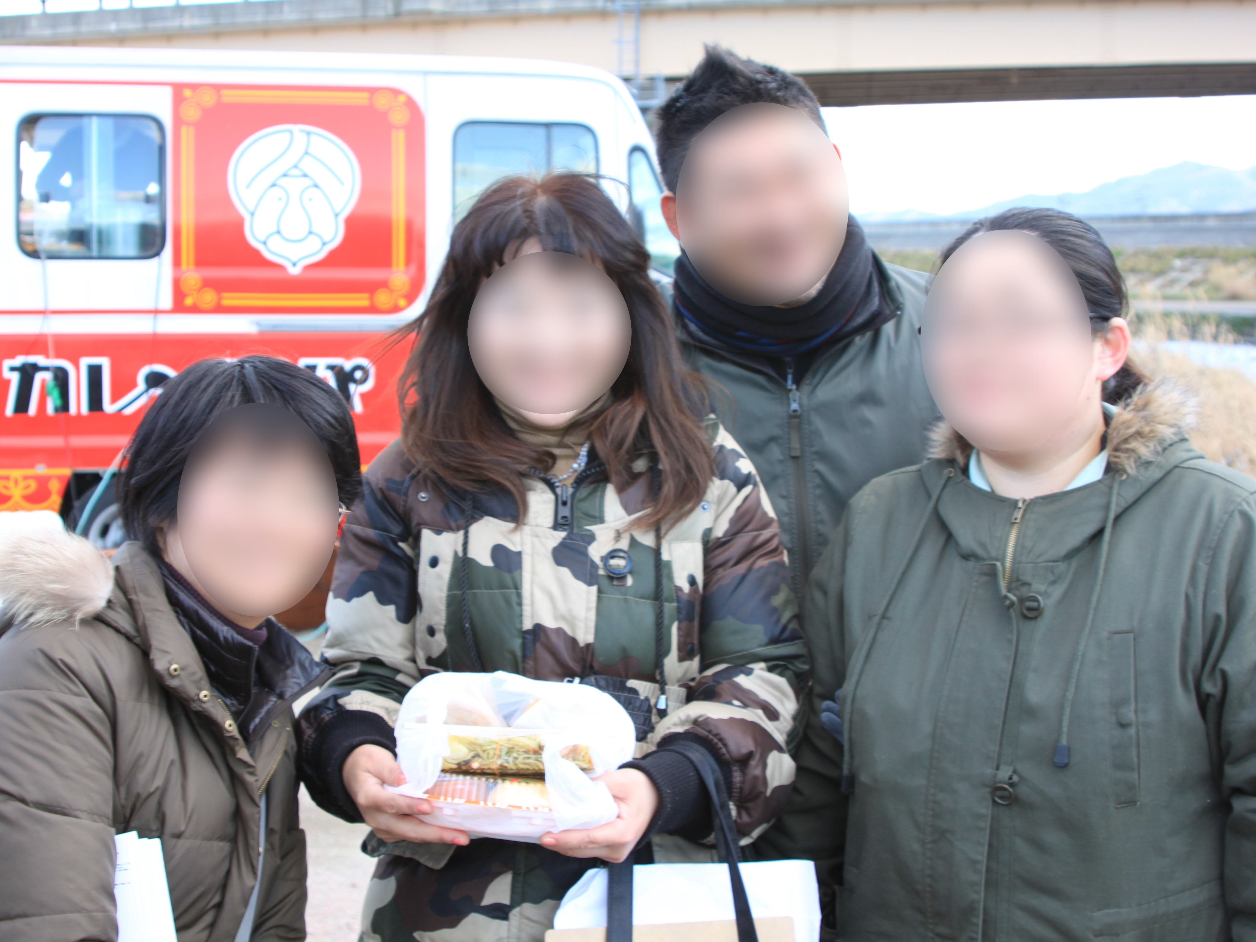 おおつち鮭まつり会場でカレーパンを手に写真撮影している様子