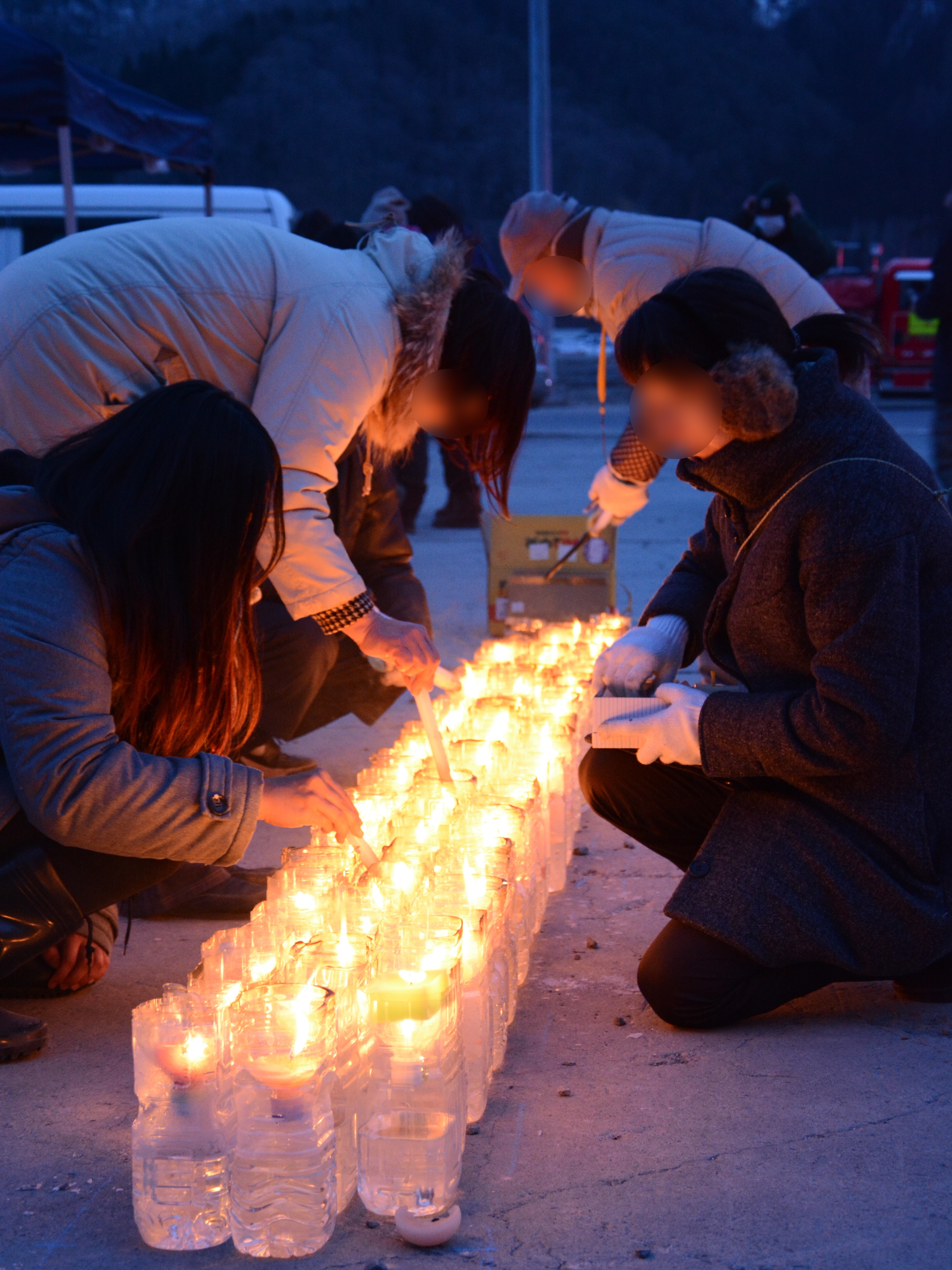 3.11集い~灯火~ 拡大表示 ダウンロード 識別子 : 10030 タイトルよみ : 3.11ツドイ~トモシビ~ 說明・要約 : 役場駐車場で開催された、大槌町NPO・ボランティア団体連絡協議会主催「3.11集い~灯火~」の様子 作成者(撮影者) : 大槌町 作成者(撮影者)よみ : オオツチチョウ 提供者 : 提供者よみ : 撮影(作成)場所 : 岩手県上閉伊郡大槌町 本町 撮影(作成)場所よみ : イワテケンカミヘイグンオオツチチョウ ホンチョウ 作成日・撮影日 : 2014年 3月 11日 カテゴリー : イベント 地域 : 町方地区 備考 : 震災事象 住民(ふるさと科 学校 住民の災害対策 イベント) > 仮設住宅 (2年目〜3年目賑わい創出)期 > 大槌町NPO・ボランティア団体連絡協議会主催「3.11鎮魂つどい〜灯火〜」開催。