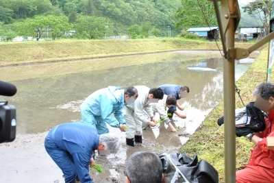 田んぼへの鍬入れや、田植えの儀の様子