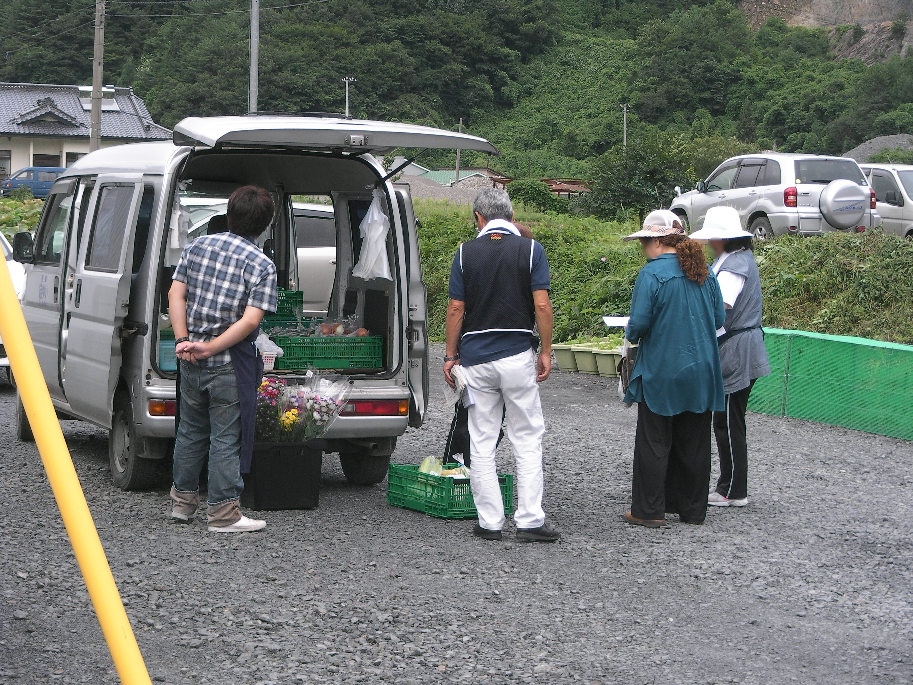 仮設住宅を軽ワゴン車で移動販売する産直「結ゆい」の様子
