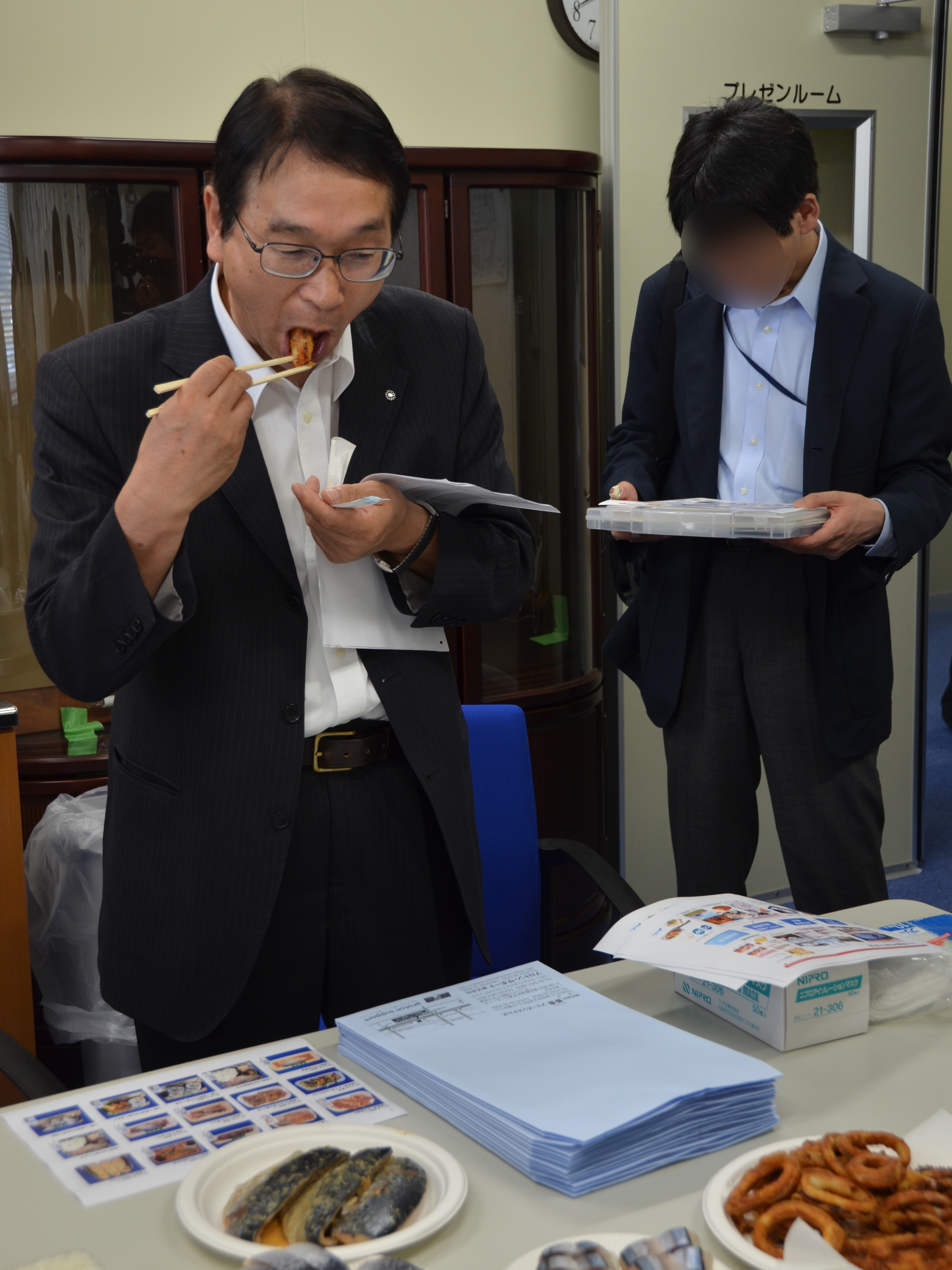 株式会社ナカショクのいか唐揚げを試食する碇川豊大槌町長