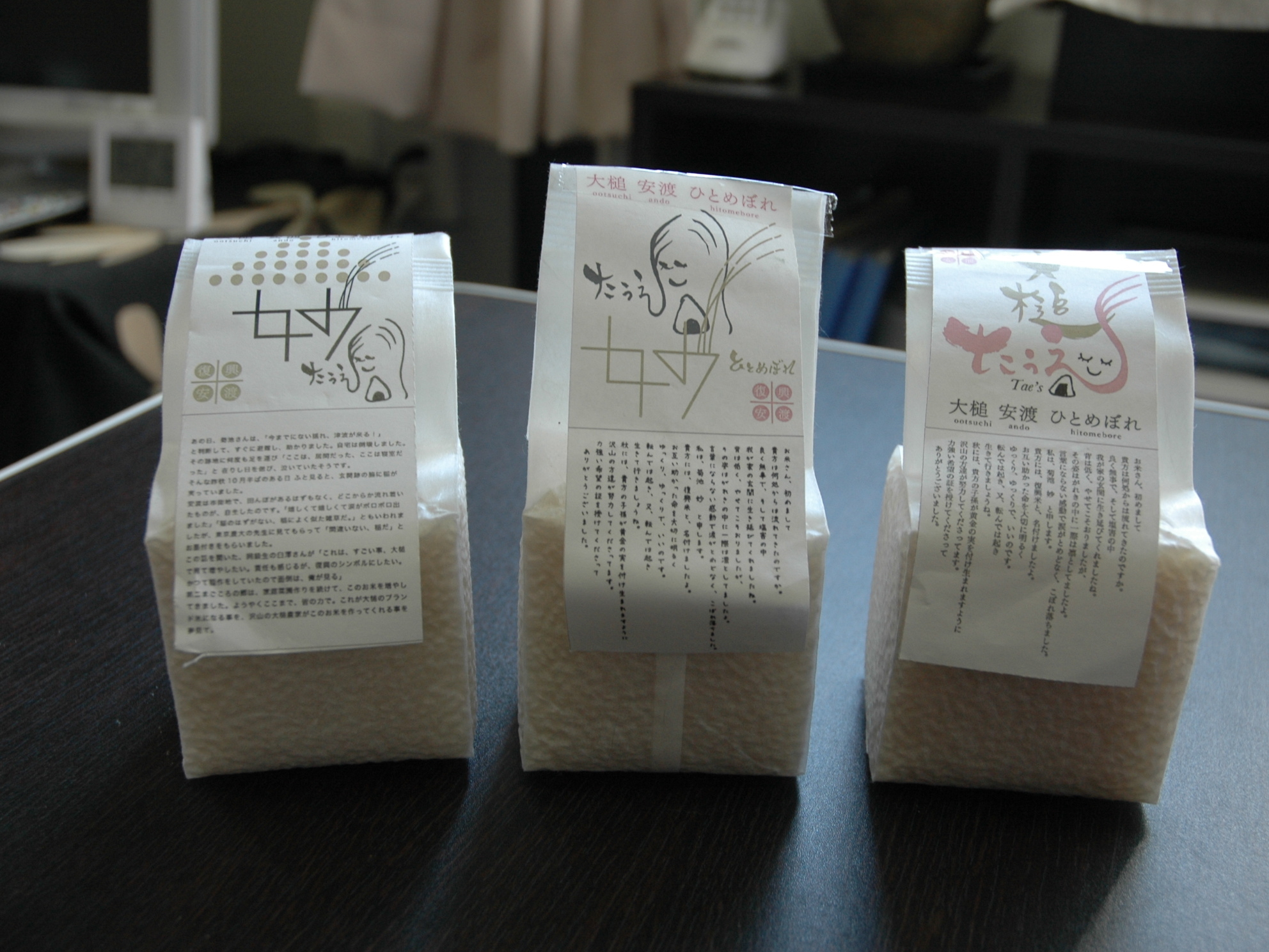 「大槌安渡ひとめぼれ」商品化 拡大表示 ダウンロード 識別子 : 11162 タイトルよみ : 「オオツチアンドヒトメボレ」ショウヒンカ 說明・要約 : 商品化された「大槌安渡ひとめぼれ」 作成者(撮影者) : 大槌町 作成者(撮影者)よみ : オオツチチョウ 提供者 : 提供者よみ : 撮影(作成)場所 : 岩手県上閉伊郡大槌町 大槌町 撮影(作成)場所よみ : イワテケンカミヘイグンオオツチチョウ オオツチチョウ 作成日・撮影日 : 2014年 3月 3日 カテゴリー : 農林水産業 地域 : その他 備考 : 震災事象 産業再生 > 復興工事に伴う移転や廃業・新規事業進出期 > 大槌安渡ひとめぼれが商品化