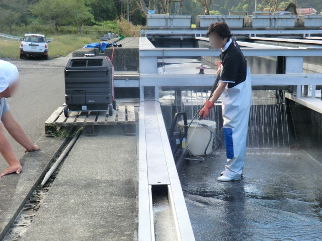 コンクリート池内に散乱していたガレキが撤去され池内を職員がホースを使って洗浄している様子