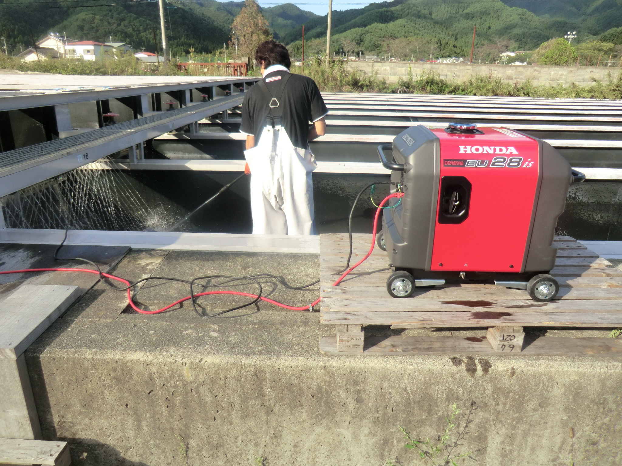 コンクリート池内に散乱していたガレキが撤去され池内を職員がホースを使って洗浄している様子