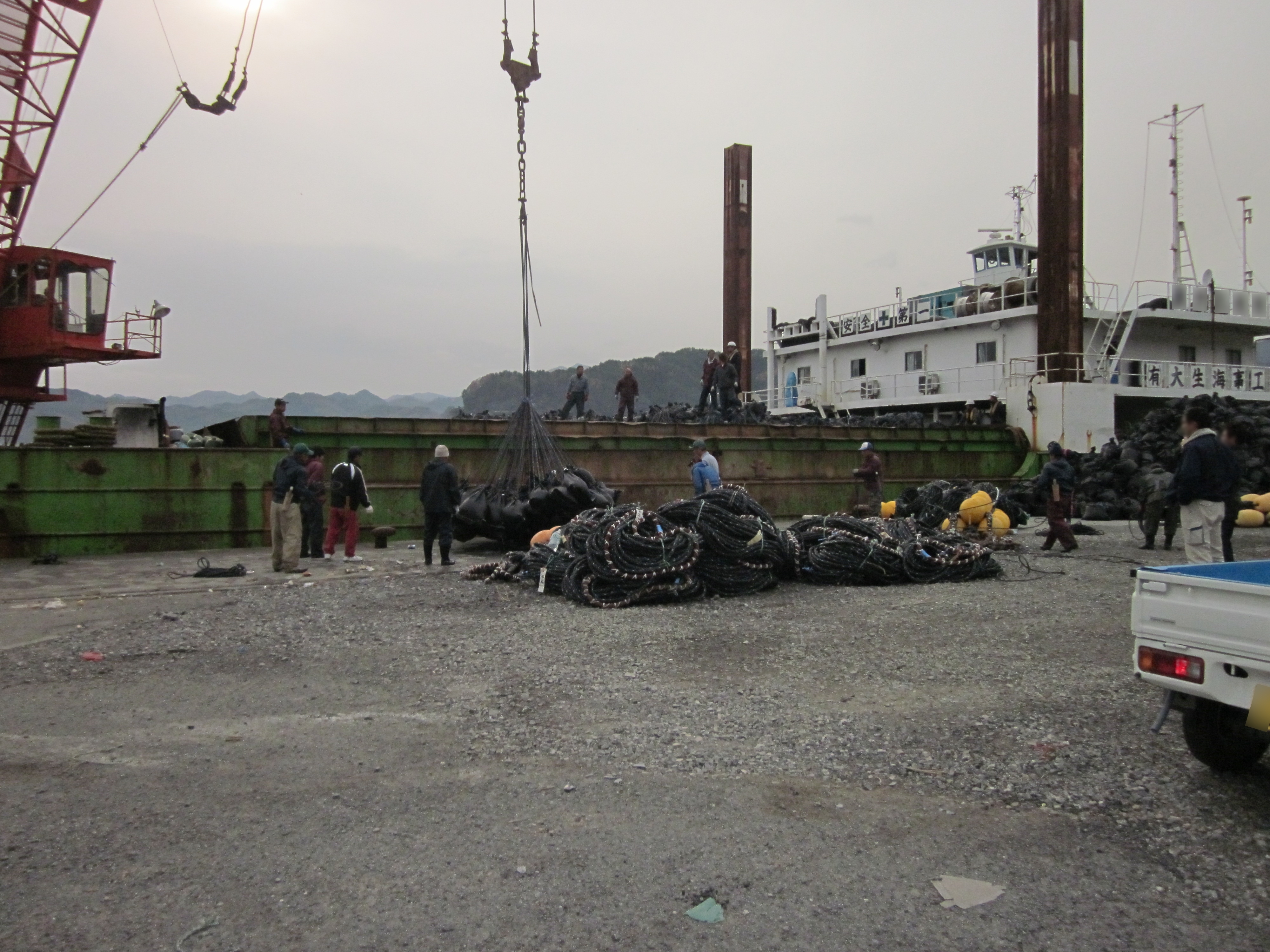 漁具の陸揚げの様子 拡大表示 ダウンロード 識別子 : 11348 タイトルよみ : ギョグノリクアゲノヨウス 說明・要約 : 漁具をクレーンを使って船から岸壁に陸揚げしている様子 作成者(撮影者) : 非公開 作成者(撮影者)よみ : ヒコウカイ 提供者 : 非公開 提供者よみ : ヒコウカイ 撮影(作成)場所 : 岩手県上閉伊郡大槌町 大槌町 撮影(作成)場所よみ : イワテケンカミヘイグンオオツチチョウ オオツチチョウ 作成日・撮影日 : 2011年 11月 28日 カテゴリー : 商工業 地域 : その他 備考 :