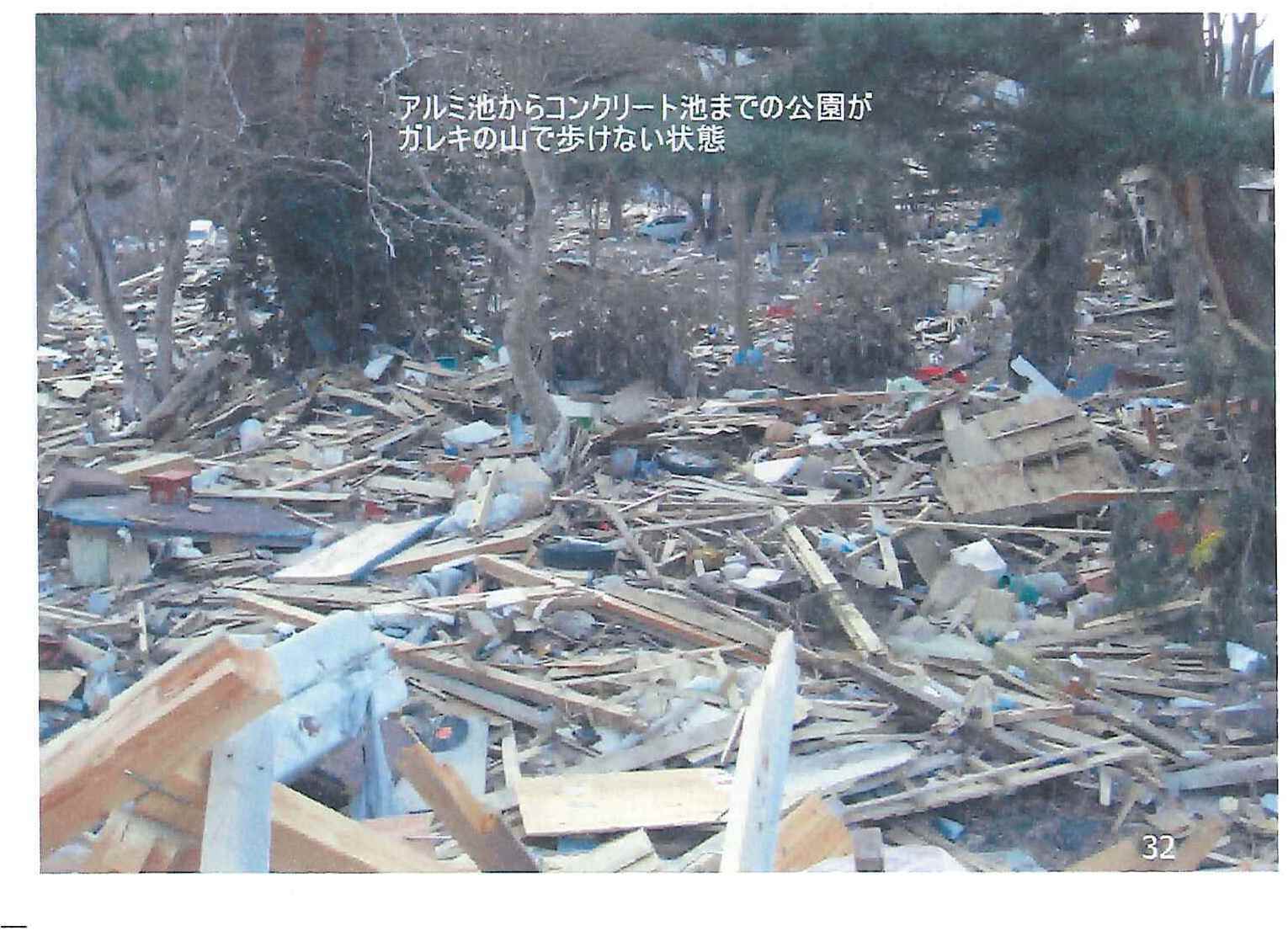 津波で運ばれてきたガレキであたり一面埋まっている様子