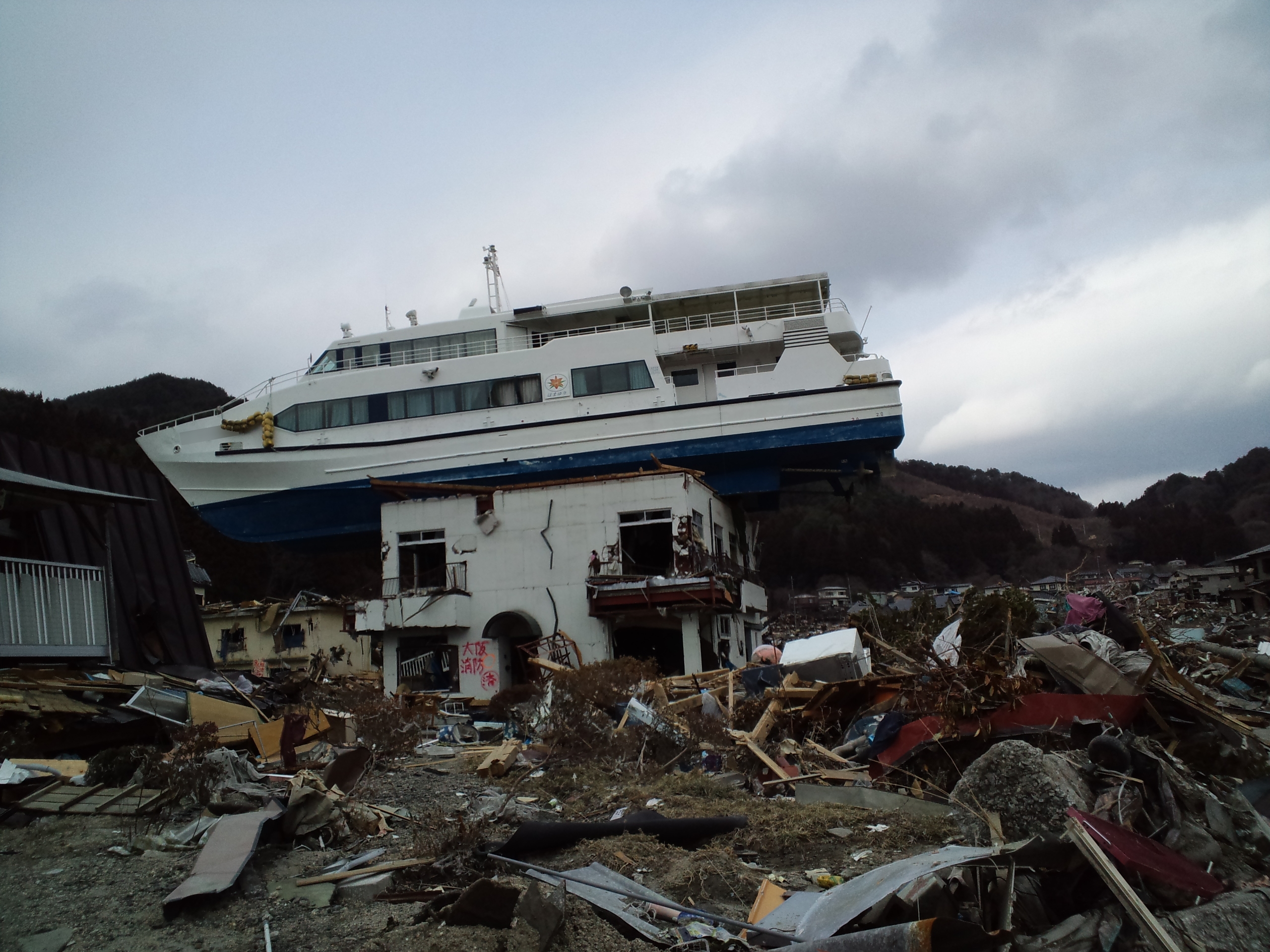 建物の2階に乗り上げた観光船 拡大表示 ダウンロード 識別子 : 13436 タイトルよみ : タテモノノ2カイニノリアゲタカンコウセン 說明・要約 : ガレキが散乱する中、建物の2階に観光船が乗り上げている 作成者(撮影者) : 大槌町 作成者(撮影者)よみ : オオツチチョウ 提供者 : 提供者よみ : 撮影(作成)場所 : 岩手県上閉伊郡大槌町 赤浜 撮影(作成)場所よみ : イワテケンカミヘイグンオオツチチョウ アカハマ 作成日・撮影日 : 2014年 3月 25日 カテゴリー : 物的被害 地域 : 赤浜地区 備考 :