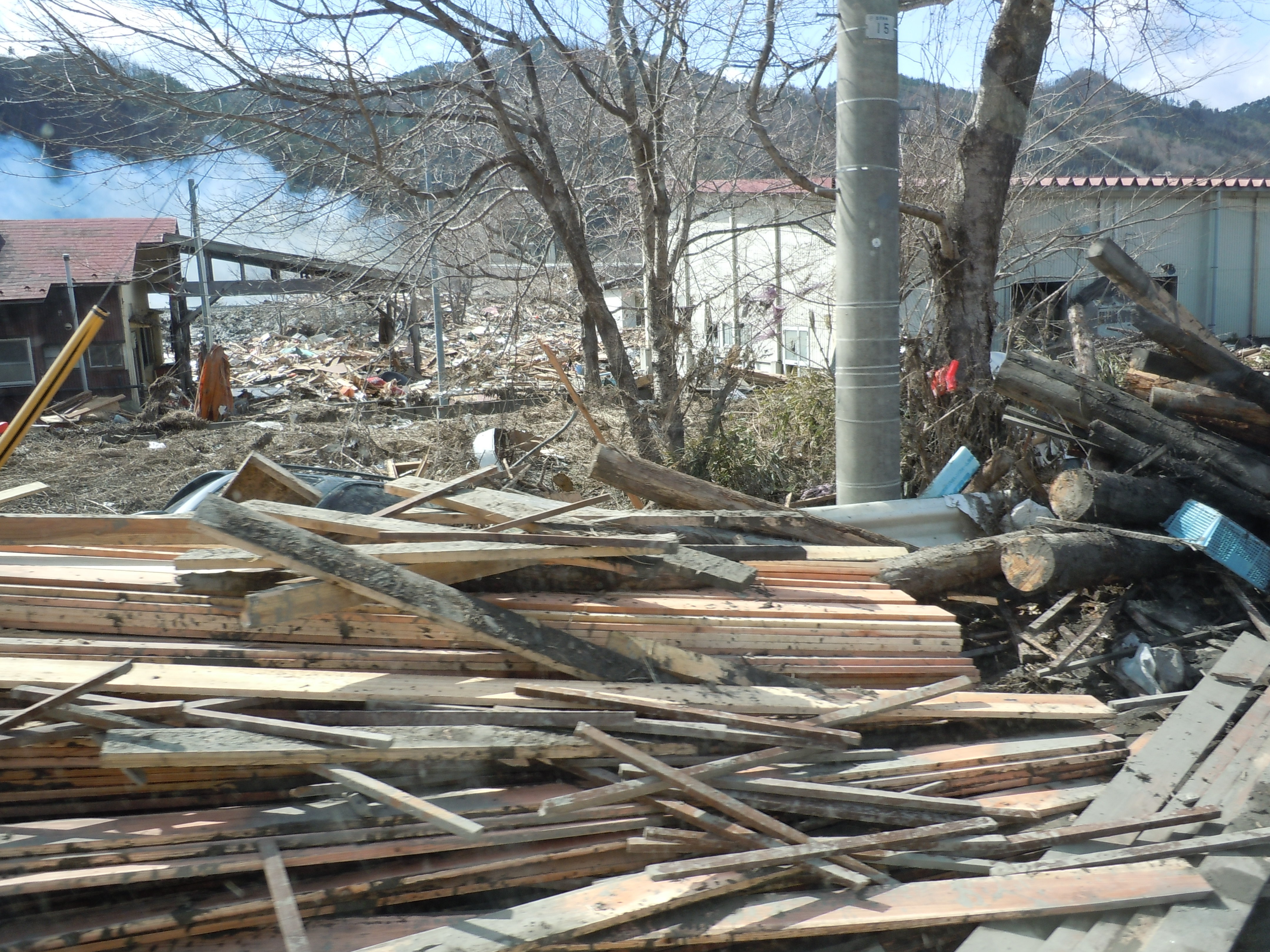片付けられた木材が積み上げられている