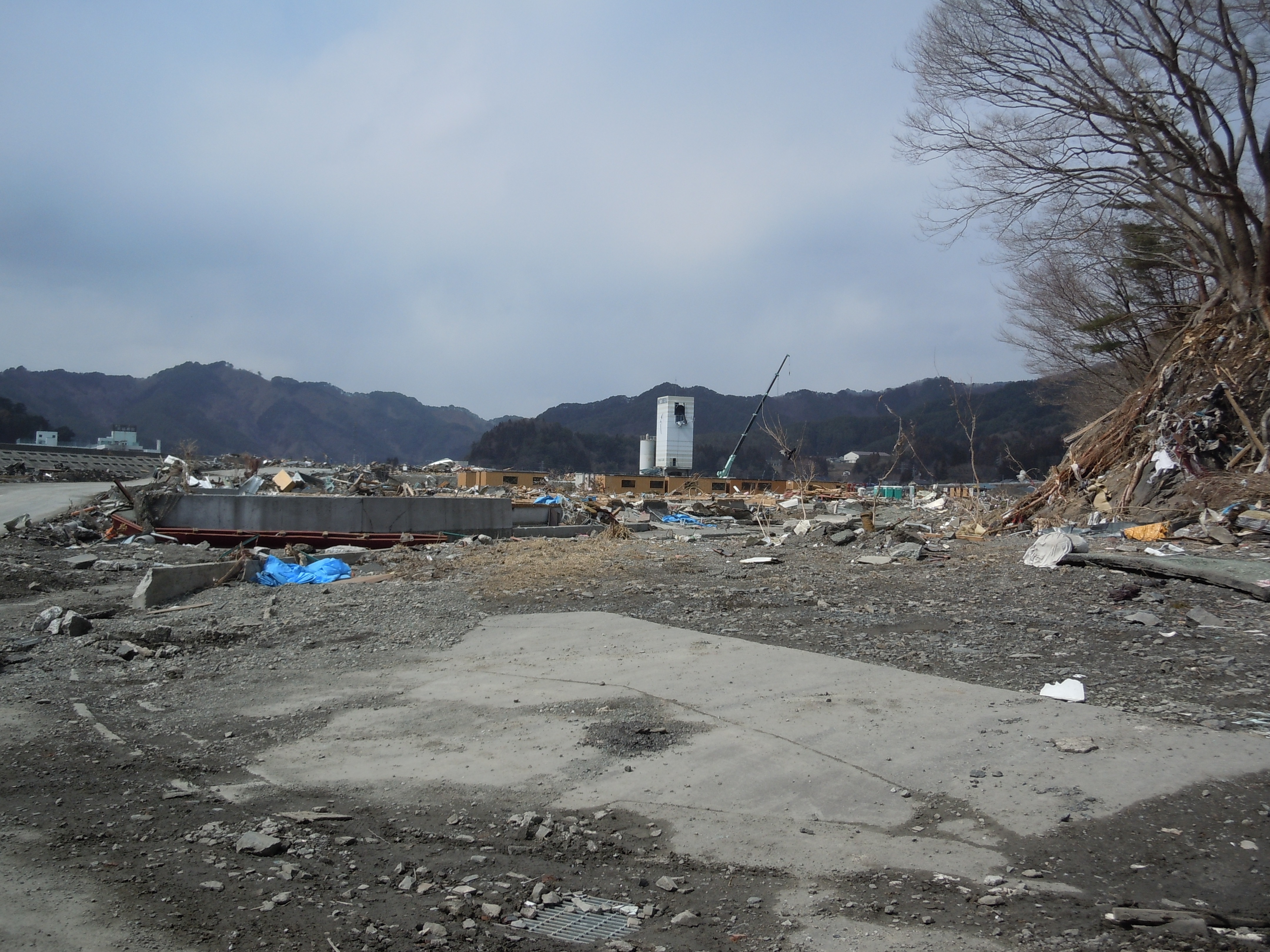大槌生コン工場近くで重機を使ってガレキ処理をしている様子