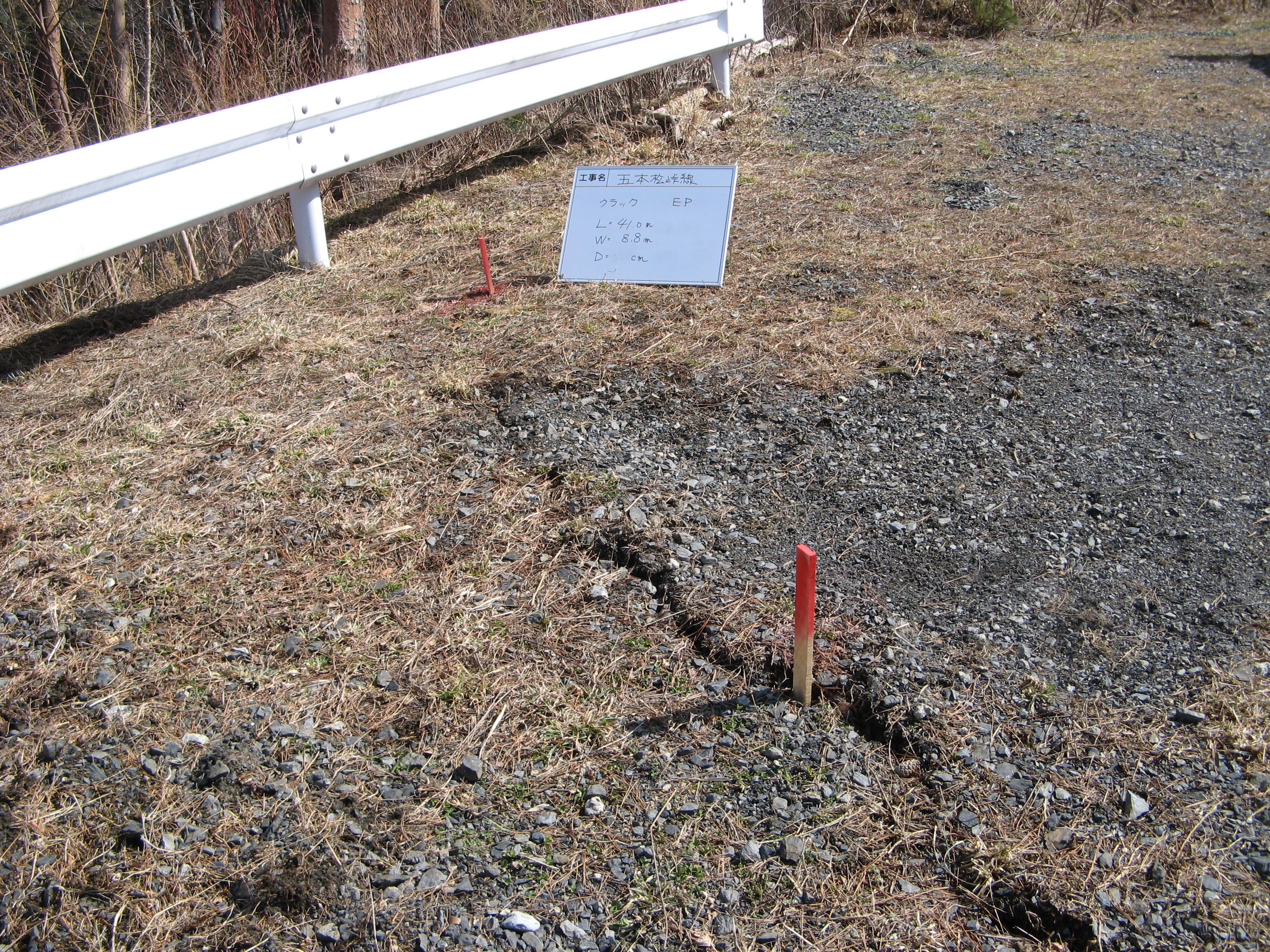 林道五本松峠線の被災状況 拡大表示 ダウンロード 識別子 : 13831 タイトルよみ : リンドウゴホンマツトウウゲセンノヒサイジョウキョウ 說明・要約 : 路面亀裂の様子 作成者(撮影者) : 大槌町 作成者(撮影者)よみ : オオツチチョウ 提供者 : 提供者よみ : 撮影(作成)場所 : 岩手県上閉伊郡大槌町 五本末峠 撮影(作成)場所よみ : イワテケンカミヘイグンオオツチチョウ ゴホンマツトウゲ 作成日・撮影日 : 2011年 3月 24日 カテゴリー : 物的被害 地域 : 小鎚・臼澤地区 備考 :