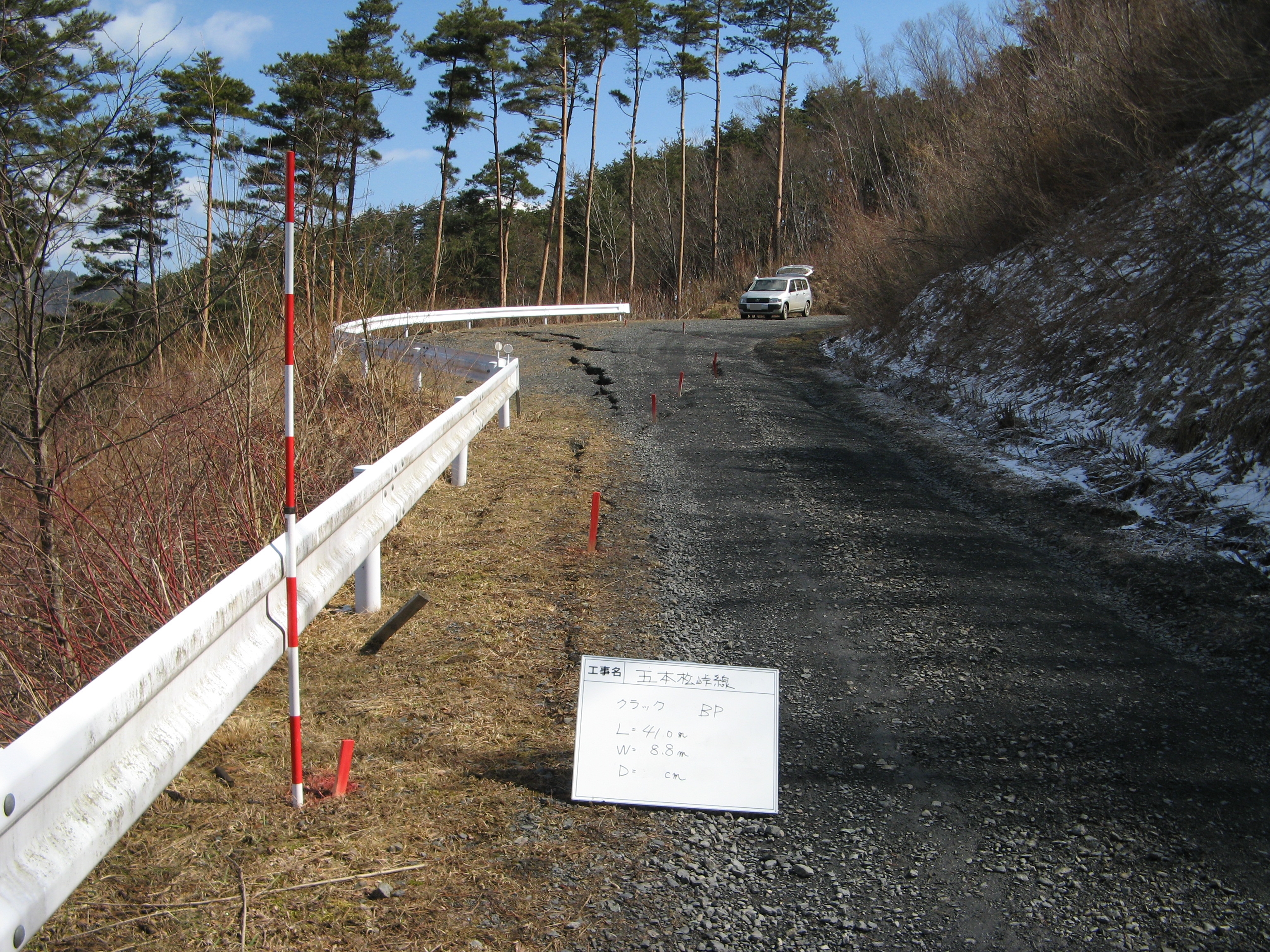 林道五本松峠線の被災状況 拡大表示 ダウンロード 識別子 : 13839 タイトルよみ : リンドウゴホンマツトウウゲセンノヒサイジョウキョウ 說明・要約 : 路面亀裂の様子 作成者(撮影者) : 大槌町 作成者(撮影者)よみ : オオツチチョウ 提供者 : 提供者よみ : 撮影(作成)場所 : 岩手県上閉伊郡大槌町 五本末峠 撮影(作成)場所よみ : イワテケンカミヘイグンオオツチチョウ ゴホンマツトウゲ 作成日・撮影日 : 2011年 3月 24日 カテゴリー : 物的被害 地域 : 小鎚・臼澤地区 備考 :