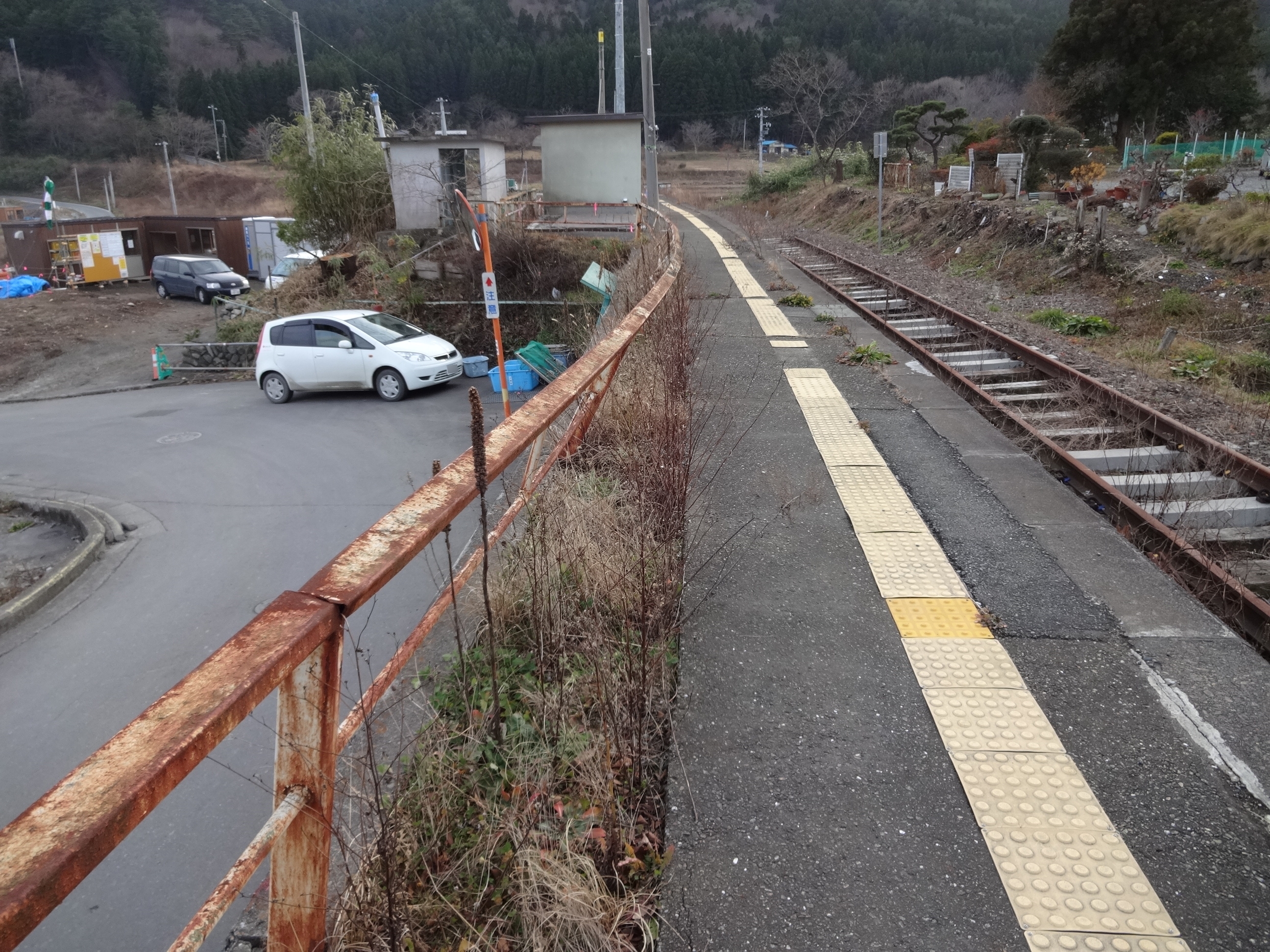 JR山田線浪板海岸駅 拡大表示 ダウンロード 識別子 : 14868 タイトルよみ : JRヤマダセンナミイタカイガンエキ 說明・要約 : ホームまで津波が押し寄せたため手摺りが曲がっている 作成者(撮影者) : 大槌町 作成者(撮影者)よみ : オオツチチョウ 提供者 : 提供者よみ : 撮影(作成)場所 : 岩手県上閉伊郡大槌町 浪板 撮影(作成)場所よみ : イワテケンカミヘイグンオオツチチョウ ナミイタ 作成日・撮影日 : 2015年 12月 15日 カテゴリー : 被害 物的被害 被災状況 地域 : 浪板地区 備考 :